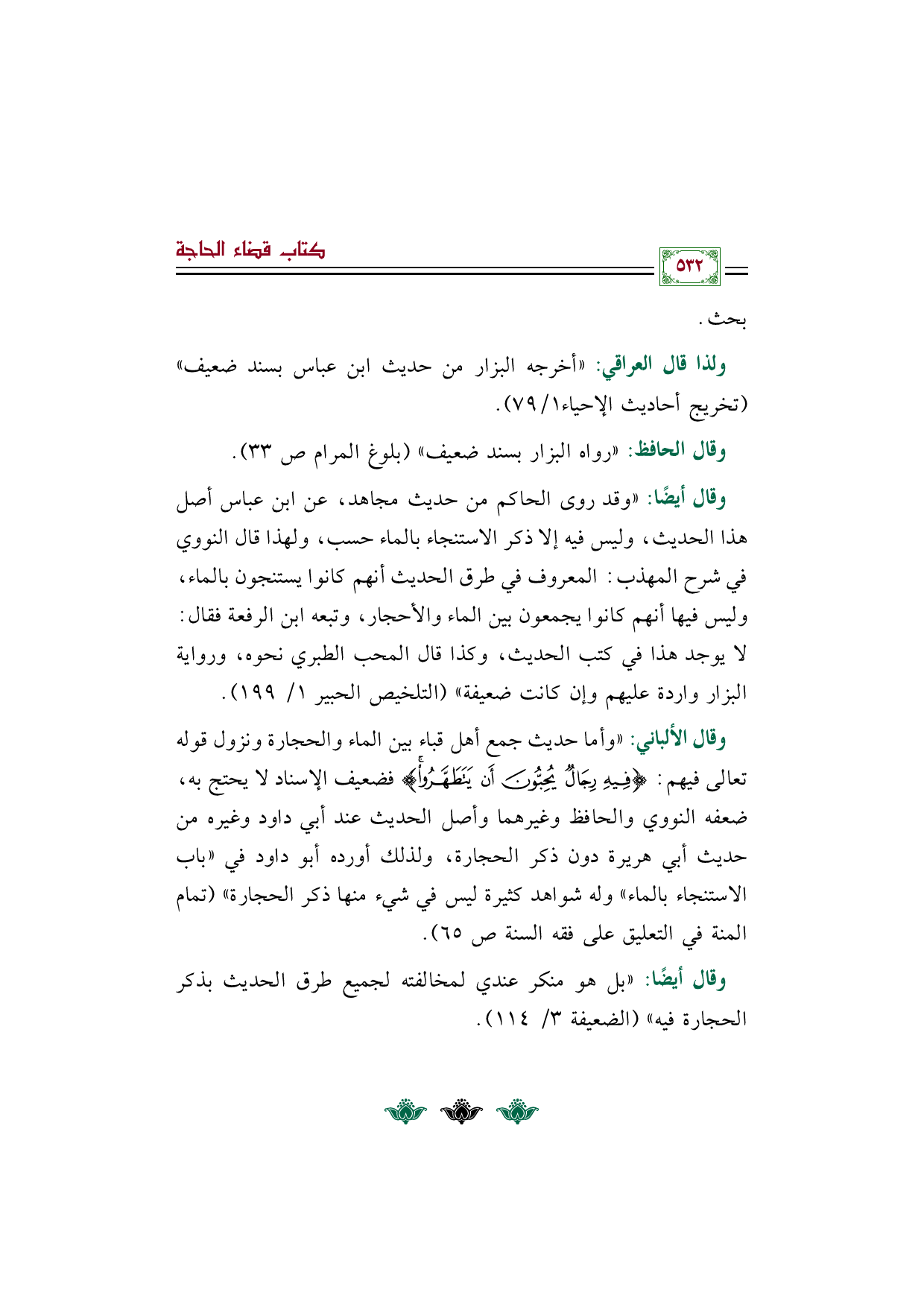 {فِيهِ رِجَالٌ يُحِبُّونَ أَنْ يَتَطَهَّرُوا} فضعيف الإسناد لا يحتج به، ضعفه النووي والحافظ وغيرهما وأصل الحديث عند أبي داود وغيره من حديث أبي هريرة دون ذكر الحجارة، ولذلك أورده أبو داود في "باب الاستنجاء بالماء" وله شواهد كثيرة ليس في شيء منها ذكر الحجارة" (تمام المنة في التعليق على فقه السنة ص ٦٥).