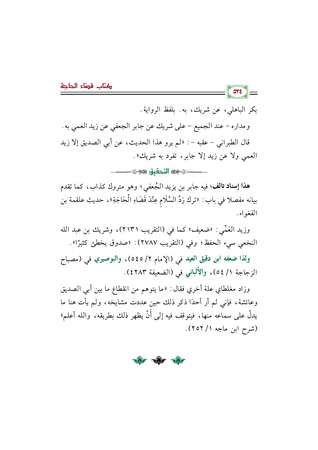 ولذا ضعفه ابن دقيق العيد في (الإمام ٢/ ٥٤٥)، والبوصيري في (مصباح الزجاجة ١/ ٥٤)، والألباني في (الضعيفة ٤٢٨٣).