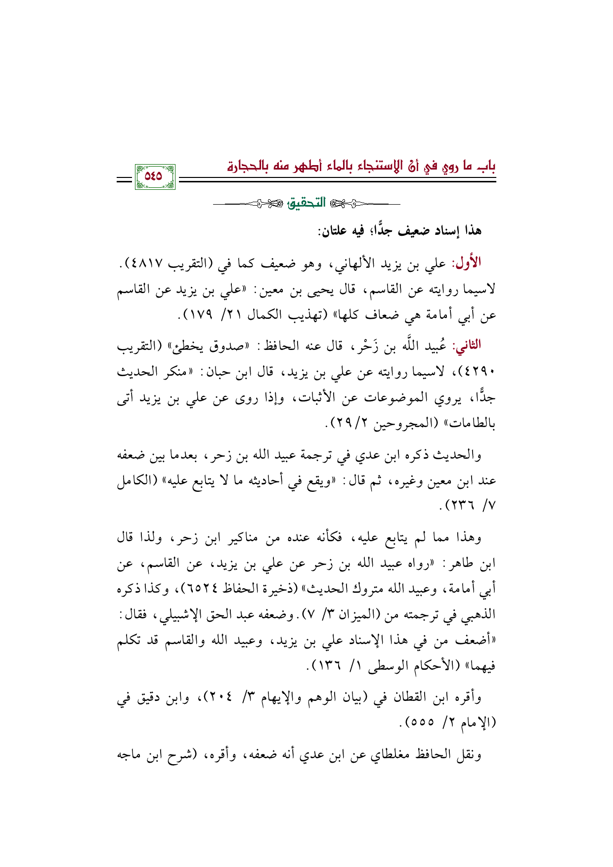 وهذا مما لم يتابع عليه، فكأنه عنده من مناكير ابن زحر، ولذا قال ابن طاهر: "رواه عبيدالله بن زحر عن علي بن يزيد، عن القاسم، عن أبي أمامة، وعبيد الله متروك الحديث" (ذخيرة الحفاظ ٦٥٢٤)، وكذا ذكره الذهبي في ترجمته من (الميزان ٣/ ٧). وضعفه عبد الحق الإشبيلي، فقال: "أضعف من في هذا الإسناد علي بن يزيد، وعبيد الله والقاسم قد تكلم فيهما" (الأحكام الوسطى ١/ ١٣٦).
