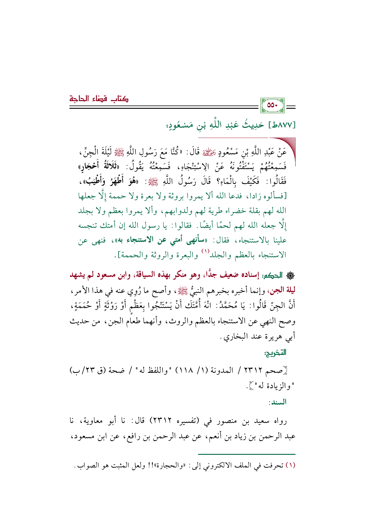 ◼ عَنْ عَبْدِ اللَّهِ بْنِ مَسْعُودٍ رضي الله عنه قَالَ: «كُنَّا مَعَ رَسُولِ اللَّهِ صَلَّى اللَّهُ عَلَيْهِ وَسَلَّمَ لَيْلَةَ الْجِنِّ، فَسَمِعْتُهُمْ يَسْتَفْتُونَهُ عَنْ الِاسْتِنْجَاءِ، فَسَمِعْتُهُ يَقُولُ: «ثَلَاثَةُ أَحْجَارٍ» فَقَالُوا: فَكَيْفَ بِالْمَاءِ؟ قَالَ رَسُولُ اللَّهِ صَلَّى اللَّهُ عَلَيْهِ وَسَلَّمَ: «هُوَ أَطْهَرُ وَأَطْيَبُ»، [فسألوه زادا، فدعا الله ألا يمروا بروثة ولا بعرة ولا حممة إِلَّا جعلها الله لهم بقلة خضراء طرية لهم ولدوابهم، وألا يمروا بعظم ولا بجلد إِلَّا جعله الله لهم لحمًا أيضًا. فقالوا: يا رسول الله إن أمتك تنجسه علينا بالاستنجاء، فقال: «سأنهى أمتي عن الاستنجاء به»، فنهى عن الاستنجاء بالعظم والجلد (¬١) والبعرة والروثة والحممة].