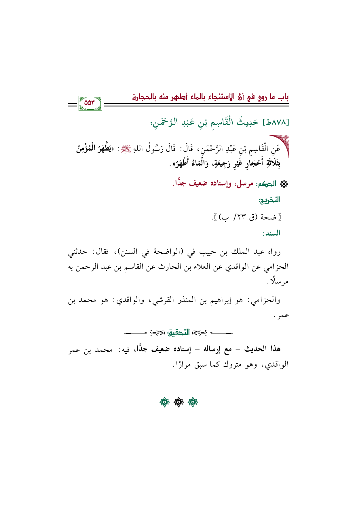 ◼ عَنِ الْقَاسِمِ بْنِ عَبْدِ الرَّحْمَنِ، قَالَ: قَالَ رَسُولُ اللهِ صلى الله عليه وسلم «يَطَّهَرُ الْمُؤْمِنُ بِثَلَاثَةِ أَحْجَارٍ غَيْرِ رَجِيعَةٍ، وَالْمَاءُ أَطْهَرُ».