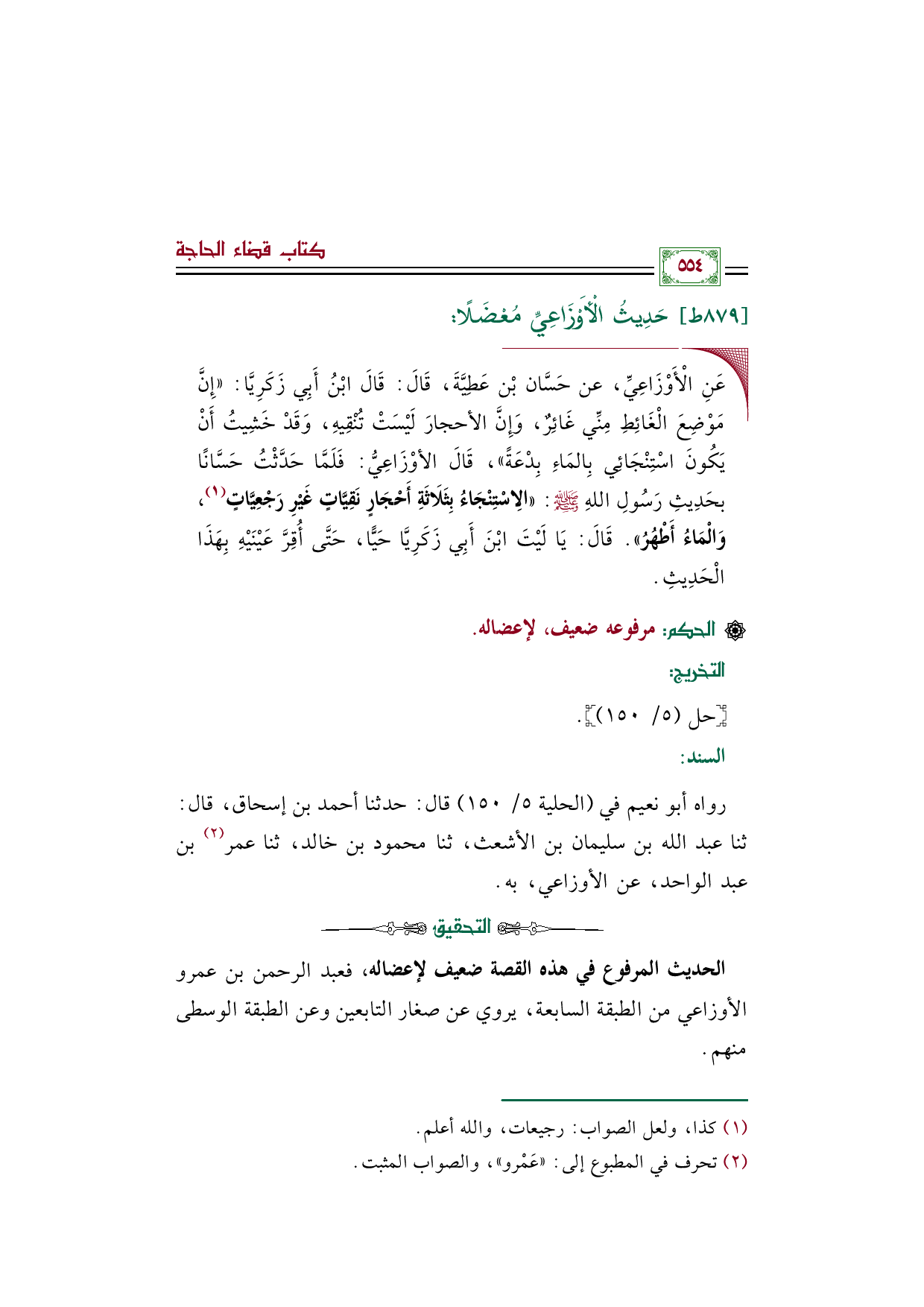 رواه أبو نعيم في (الحلية ٥/ ١٥٠) قال: حدثنا أحمد بن إسحاق، قال: ثنا عبد الله بن سليمان بن الأشعث، ثنا محمود بن خالد، ثنا عمر (¬٢) بن عبد الواحد، عن الأوزاعي، به.