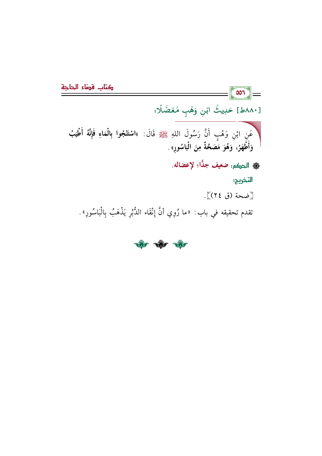 ◼ عَنِ ابْنِ وَهْبٍ أَنَّ رَسُولَ اللهِ صلى اله عليه وسلم قَالَ: «اسْتَنْجُوا بِالْمَاءِ فَإِنَّهُ أَطْيَبُ وَأَطْهَرُ، وَهُوَ مَصَحَّةٌ مِنَ الْبَاسُورِ».