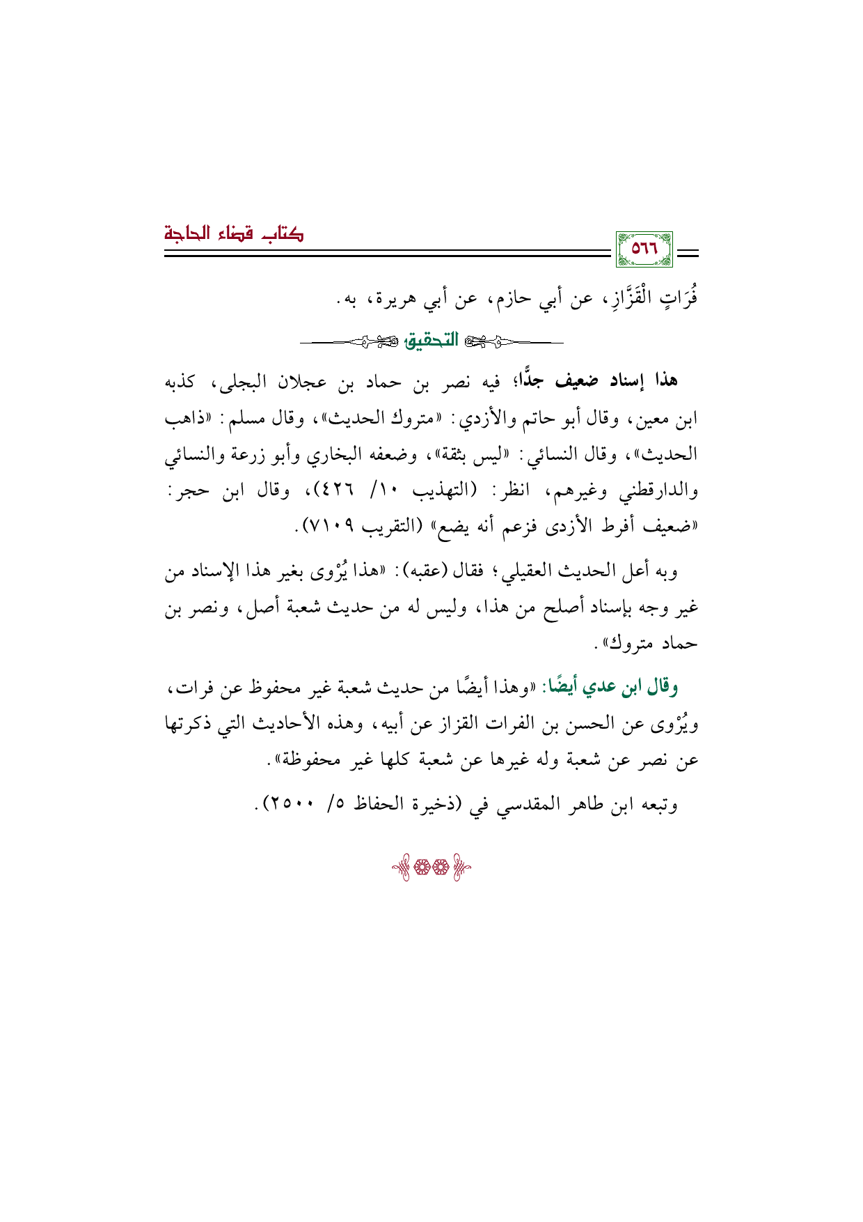 وبه أعل الحديث العقيلي؛ فقال (عقبه): "هذا يُرْوى بغير هذا الإسناد من غير وجه بإسناد أصلح من هذا، وليس له من حديث شعبة أصل، ونصر بن حماد متروك".