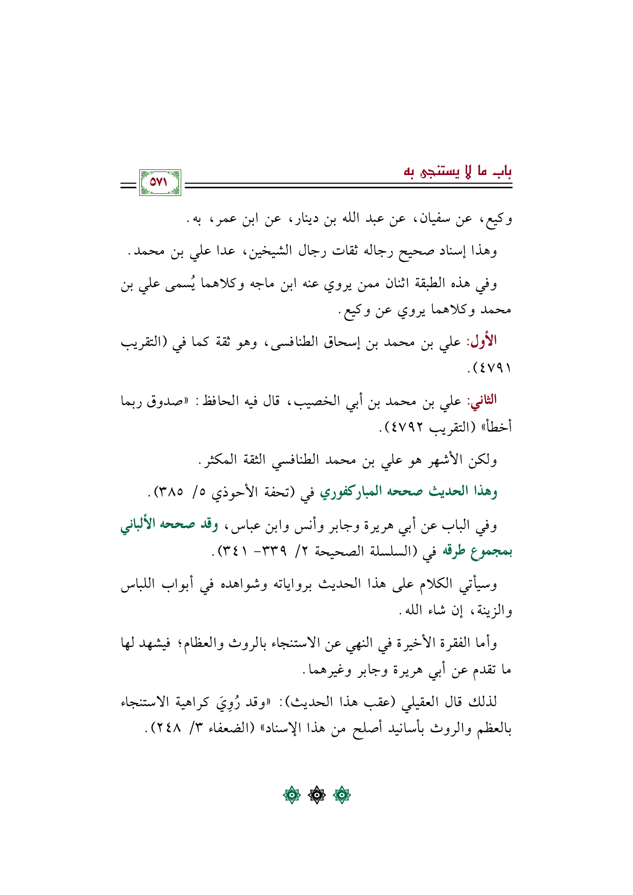 لذلك قال العقيلي (عقب هذا الحديث): "وقد رُوِيَ كراهية الاستنجاء بالعظم والروث بأسانيد أصلح من هذا الإسناد" (الضعفاء ٣/ ٢٤٨).