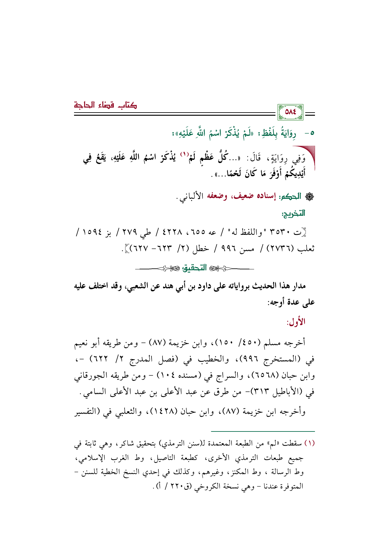 (¬١) سقطت "لم" من الطبعة المعتمدة لسنن الترمذي بتحقيق شاكر، وهي ثابتة في جميع طبعات الترمذي الأخرى، كطبعة التاصيل، وط الغرب الإسلامي، وط الرسالة، وط المكنز، وغيرهم، وكذلك في إحدي النسخ الخطية للسنن - المتوفرة عندنا - وهي نسخة الكروخي (ق ٢٢٠ / أ).