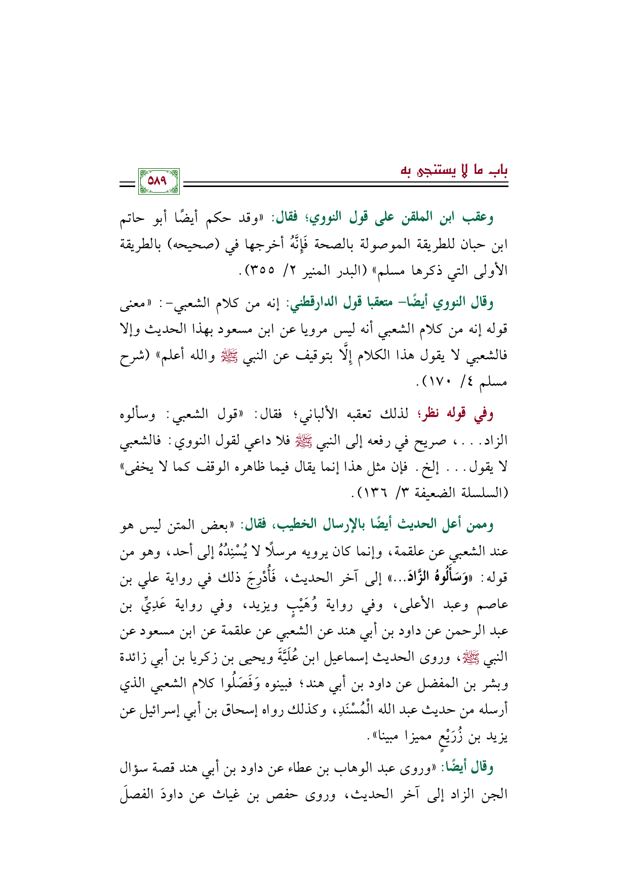 وقال النووي أيضًا- متعقبا قول الدارقطني: إنه من كلام الشعبي-: "معنى قوله إنه من كلام الشعبي أنه ليس مرويا عن ابن مسعود بهذا الحديث وإلا فالشعبي لا يقول هذا الكلام إِلَّا بتوقيف عن النبي صلى الله عليه وسلم والله أعلم" (شرح مسلم ٤/ ١٧٠).