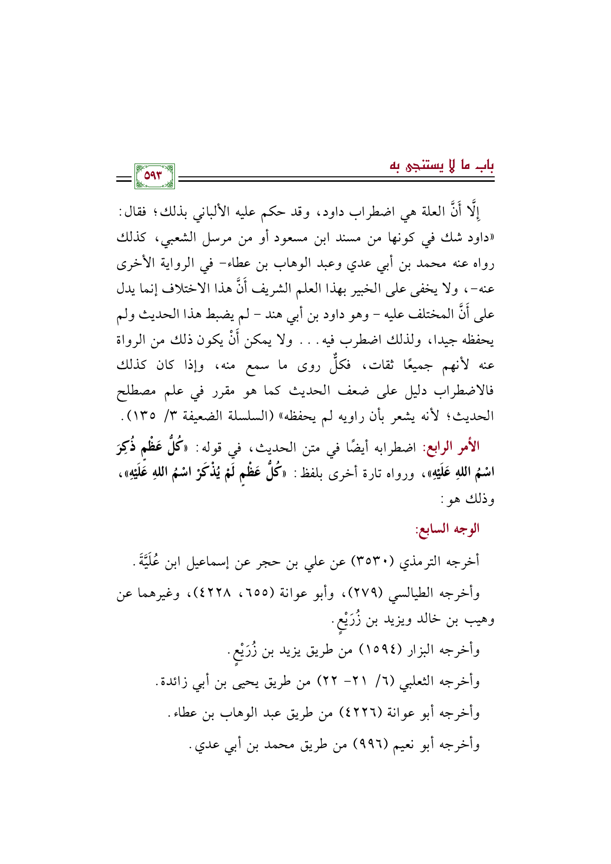 إِلَّا أَنَّ العلة هي اضطراب داود، وقد حكم عليه الألباني بذلك؛ فقال: "داود شك في كونها من مسند ابن مسعود أو من مرسل الشعبي، كذلك رواه عنه محمد بن أبي عدي وعبد الوهاب بن عطاء- في الرواية الأخرى عنه-، ولا يخفى على الخبير بهذا العلم الشريف أَنَّ هذا الاختلاف إنما يدل على أَنَّ المختلف عليه- وهو داود بن أبي هند- لم يضبط هذا الحديث ولم يحفظه جيدا، ولذلك اضطرب فيه ... ولا يمكن أَنْ يكون ذلك من الرواة عنه لأنهم جميعًا ثقات، فكلٌّ روى ما سمع منه، وإذا كان كذلك فالاضطراب دليل على ضعف الحديث كما هو مقرر في علم مصطلح الحديث؛ لأنه يشعر بأن راويه لم يحفظه" (السلسلة الضعيفة ٣/ ١٣٥).