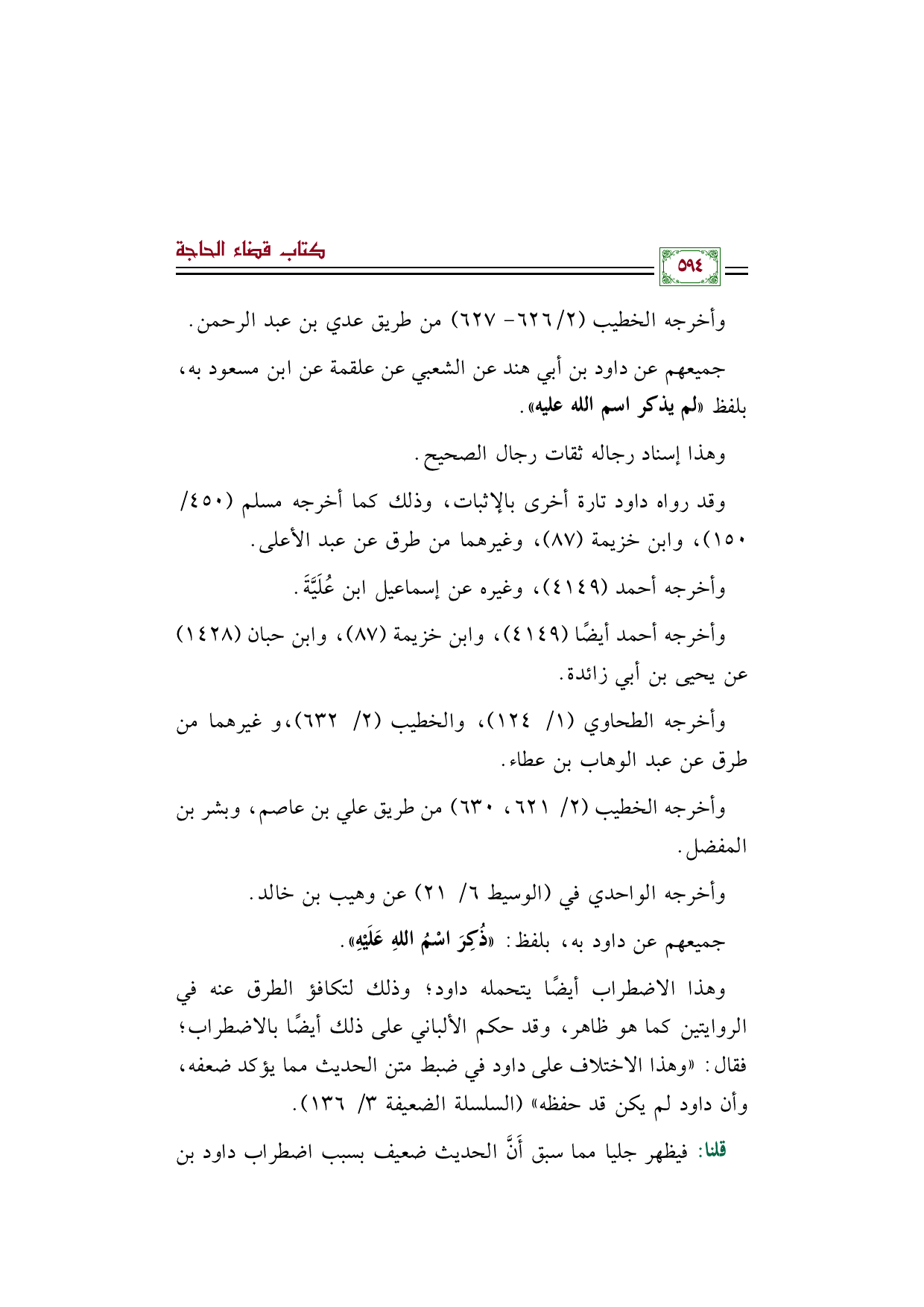 قلنا: فيظهر جليا مما سبق أَنَّ الحديث ضعيف بسبب اضطراب داود بن