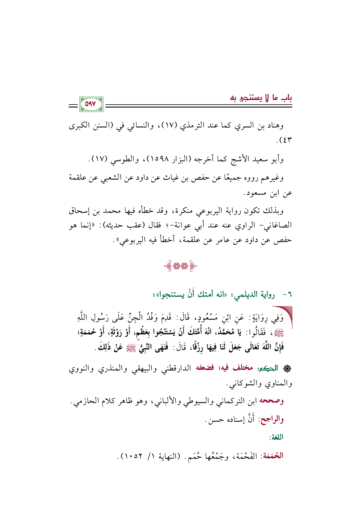 • وَفِي رِوَايَةٍ: عَنِ ابْنِ مَسْعُودٍ، قَالَ: قَدِمَ وَفْدُ الْجِنِّ عَلَى رَسُولِ اللَّهِ صلى الله عليه وسلم، فَقَالُوا: يَا مُحَمَّدُ، انْهَ أُمَّتَكَ أَنْ يَسْتَنْجُوا بِعَظْمٍ، أَوْ رَوْثَةٍ، أَوْ حُمَمَةٍ؛ فَإِنَّ اللَّهَ تَعَالَى جَعَلَ لَنَا فِيهَا رِزْقًا، قَالَ: فَنَهَى النَّبِيُّ صلى الله عليه وسلم عَنْ ذَلِكَ.
