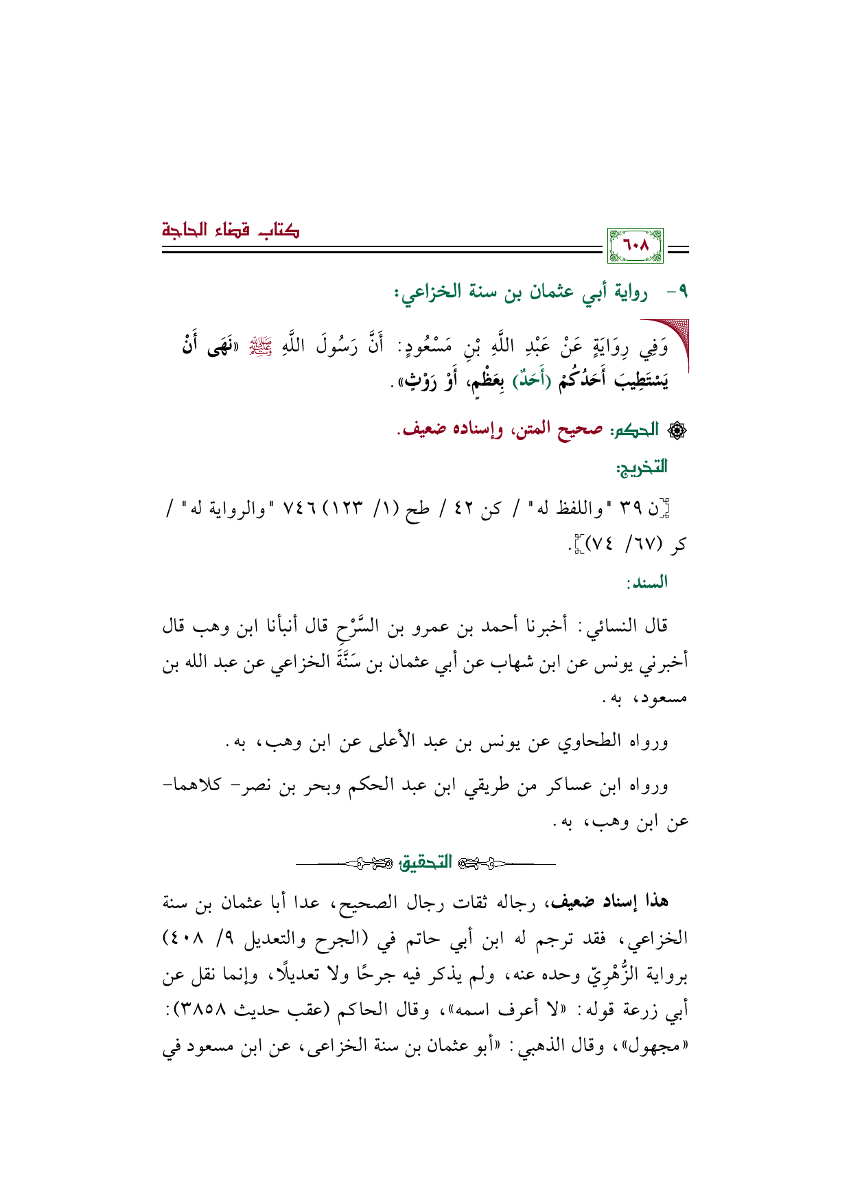 قال النسائي: أخبرنا أحمد بن عمرو بن السَّرْحِ قال أنبأنا ابن وهب قال أخبرني يونس عن ابن شهاب عن أبي عثمان بن سَنَّةَ الخزاعي عن عبد الله بن مسعود، به.