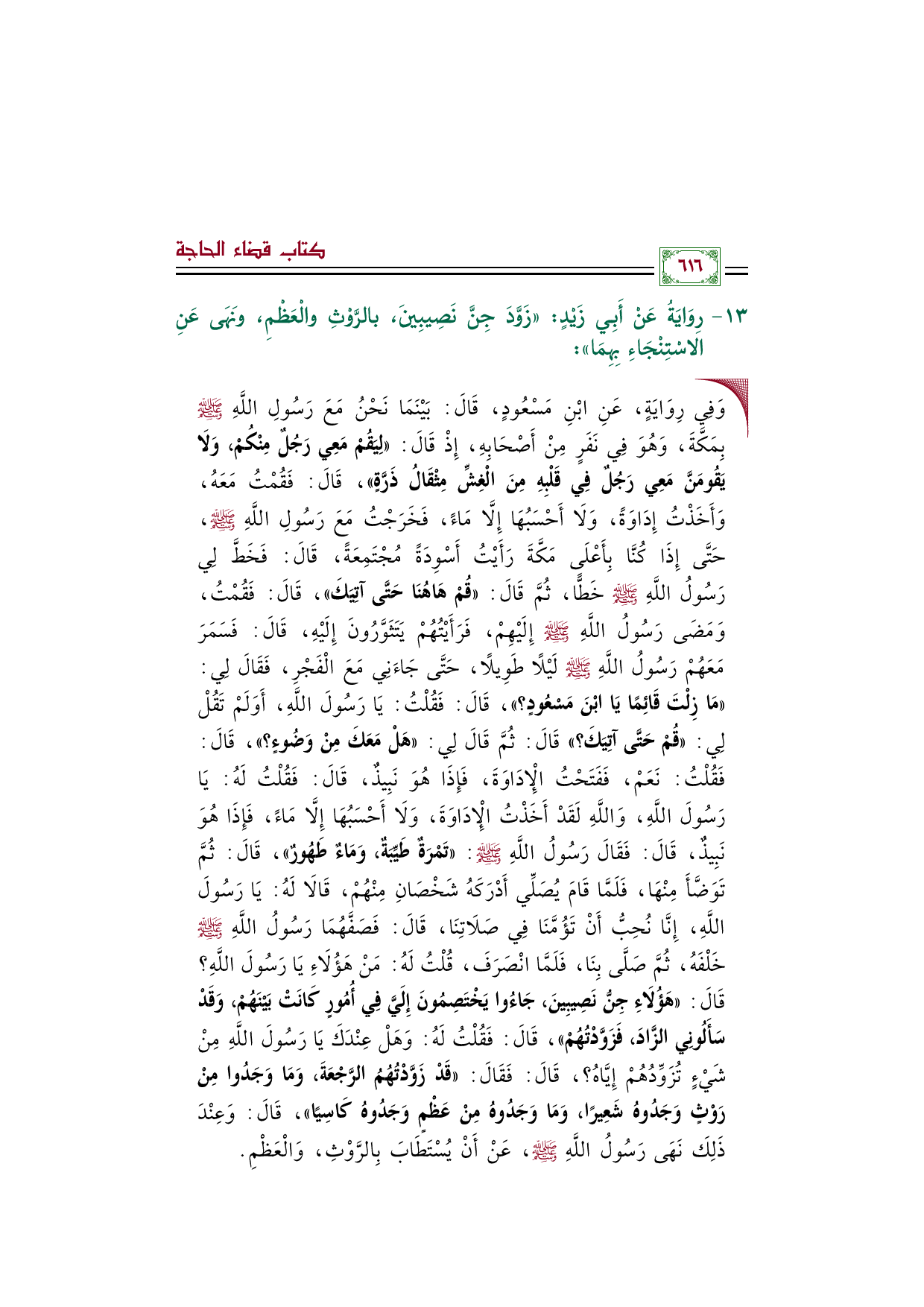 عَلَيْهِ وَسَلَّمَ خَلْفَهُ، ثُمَّ صَلَّى بِنَا، فَلَمَّا انْصَرَفَ، قُلْتُ لَهُ: مَنْ هَؤُلَاءِ يَا رَسُولَ اللَّهِ؟ قَالَ: «هَؤُلَاءِ جِنُّ نَصِيبِينَ، جَاءُوا يَخْتَصِمُونَ إِلَيَّ فِي أُمُورٍ كَانَتْ بَيْنَهُمْ، وَقَدْ سَأَلُونِي الزَّادَ، فَزَوَّدْتُهُمْ»، قَالَ: فَقُلْتُ لَهُ: وَهَلْ عِنْدَكَ يَا رَسُولَ اللَّهِ مِنْ شَيْءٍ تُزَوِّدُهُمْ إِيَّاهُ؟، قَالَ: فَقَالَ: «قَدْ زَوَّدْتُهُمُ الرَّجْعَةَ، وَمَا وَجَدُوا مِنْ رَوْثٍ وَجَدُوهُ شَعِيرًا، وَمَا وَجَدُوهُ مِنْ عَظْمٍ وَجَدُوهُ كَاسِيًا»، قَالَ: وَعِنْدَ ذَلِكَ نَهَى رَسُولُ اللَّهِ صَلَّى اللهُ عَلَيْهِ وَسَلَّمَ، عَنْ أَنْ يُسْتَطَابَ بِالرَّوْثِ، وَالْعَظْمِ.