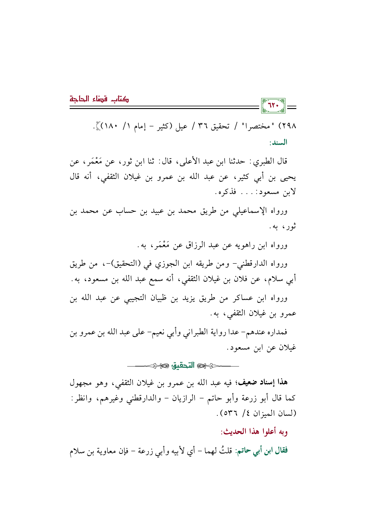 قال الطبري: حدثنا ابن عبد الأعلى، قال: ثنا ابن ثور، عن مَعْمَر، عن يحيى بن أبي كثير، عن عبد الله بن عمرو بن غيلان الثقفي، أنه قال لابن مسعود: ... فذكره.