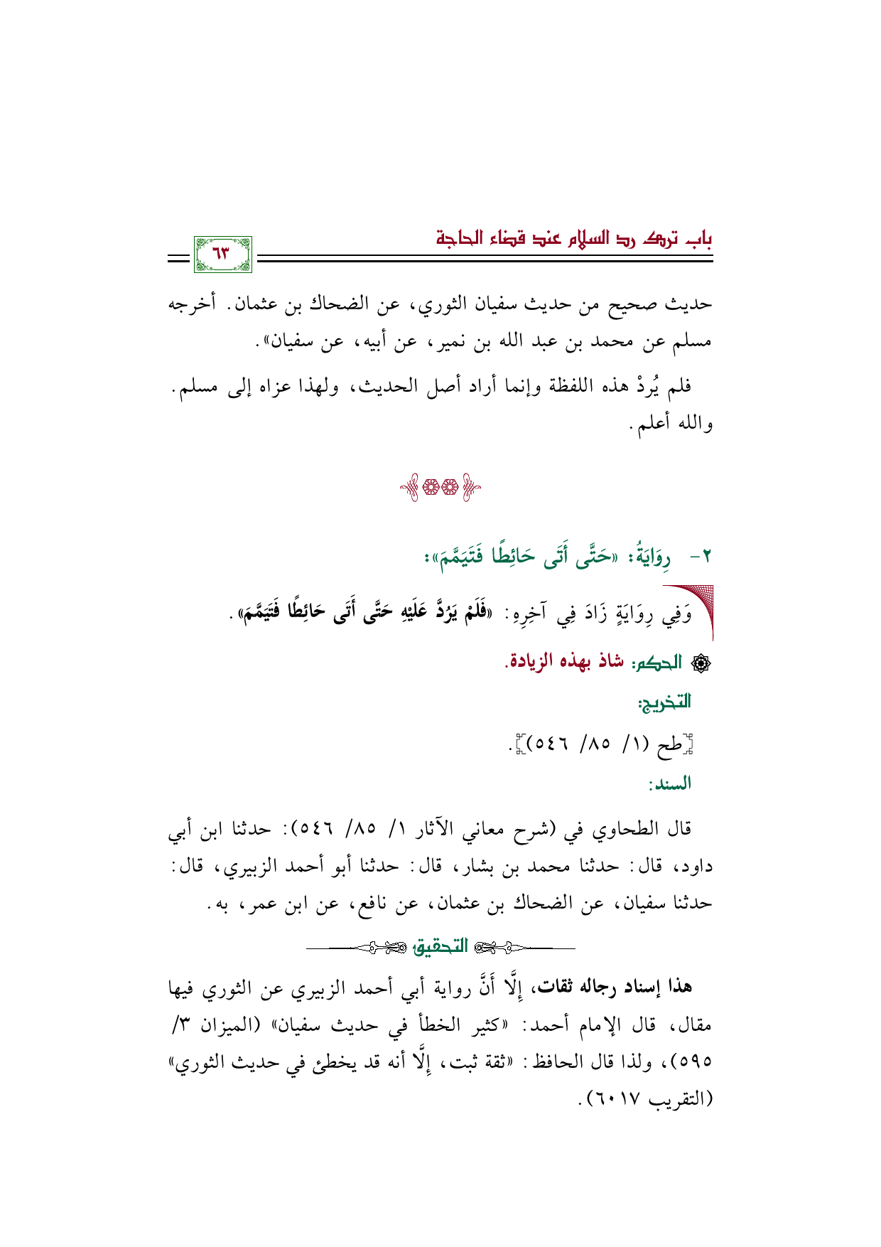قال الطحاوي في (شرح معاني الآثار ١/ ٨٥/ ٥٤٦): حدثنا ابن أبي داود، قال: حدثنا محمد بن بشار، قال: حدثنا أبو أحمد الزبيري، قال: حدثنا سفيان، عن الضحاك بن عثمان، عن نافع، عن ابن عمر، به.