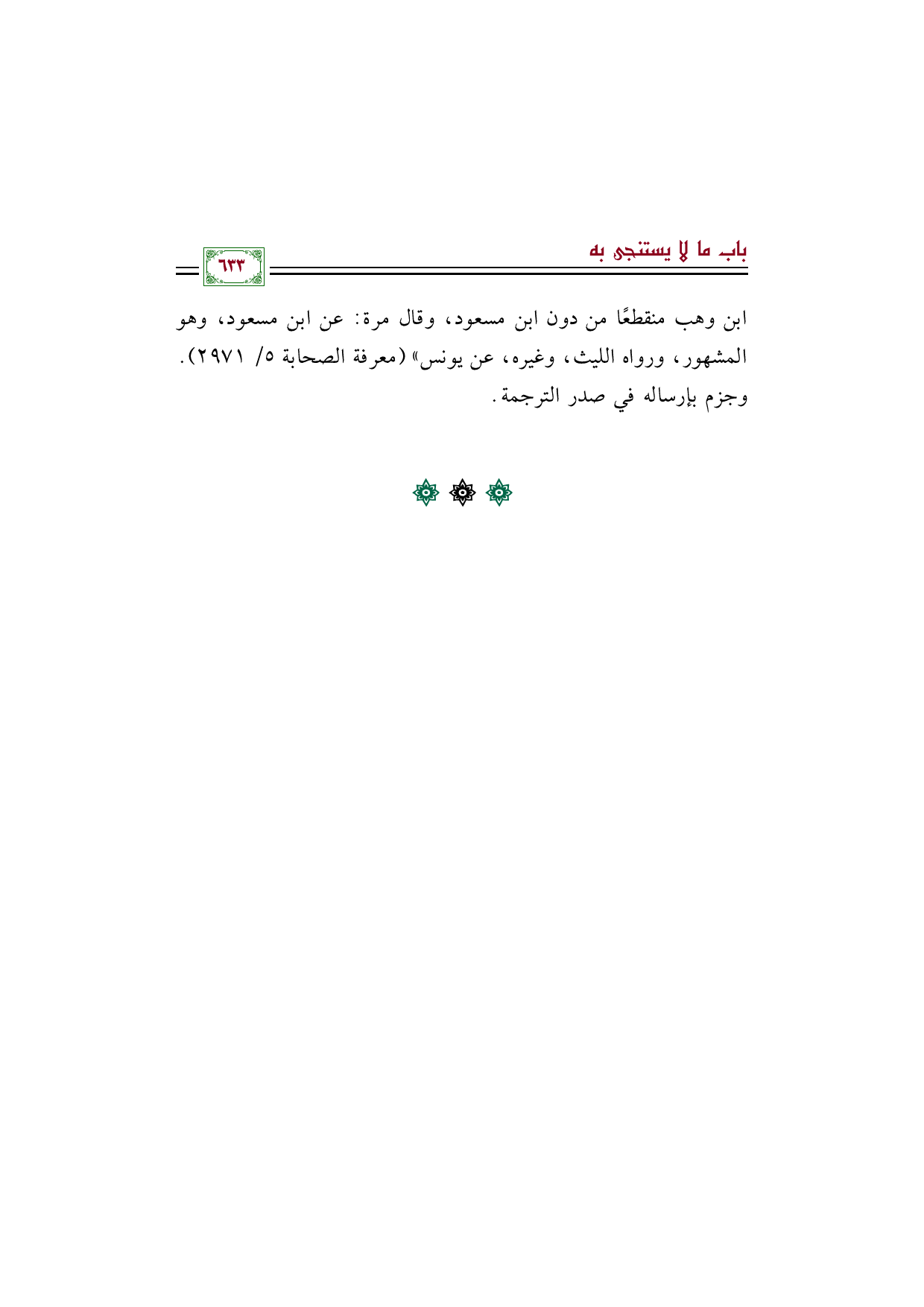 ابن وهب منقطعًا من دون ابن مسعود، وقال مرة: عن ابن مسعود، وهو المشهور، ورواه الليث، وغيره، عن يونس" (معرفة الصحابة ٥/ ٢٩٧١). وجزم بإرساله في صدر الترجمة.