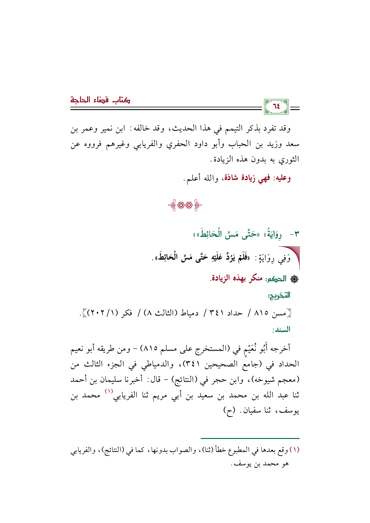 وقد تفرد بذكر التيمم في هذا الحديث، وقد خالفه: ابن نمير وعمر بن سعد وزيد بن الحباب وأبو داود الحفري والفريابي وغيرهم فرووه عن الثوري به بدون هذه الزيادة.