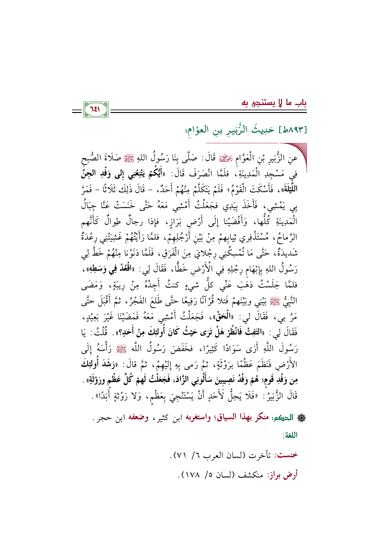◼ عنِ الزُّبَيرِ بْنِ الْعَوَّامِ رضي الله عنه قَالَ: صَلَّى بِنَا رَسُولُ اللهِ صلى الله عليه وسلم صَلَاةَ الصُّبحِ فِي مَسْجِدِ الْمَدِينَةِ، فلَمَّا انْصَرَفَ قَالَ: «أَيُّكُمْ يَتْبَعُنِي إِلى وَفْدِ الجِنِّ اللَّيْلَةَ»، فَأَسْكَتَ الْقَوْمُ؛ فَلَمْ يَتَكَلَّمْ مِنْهُمْ أَحَدٌ، - قَالَ ذَلِكَ ثَلَاثًا - فَمَرَّ بِي يَمْشِي، فَأَخَذَ بِيَدِي فجَعَلْتُ أَمْشِي مَعَهُ حَتَّى خَنَسَتْ عَنَّا جِبَالُ الْمَدِينَةِ كُلُّها، وَأَفْضَيْنا إِلَى أَرْضِ بَرَازٍ، فإِذا رجالٌ طِوالٌ كَأَنَّهم الرِّماحُ، مُسْتَذْفِري ثِيابِهمْ مِنْ بَيْنِ أَرْجُلِهِمْ، فلمَّا رَأَيْتُهُمْ غَشِيَتْنِي رِعْدَةٌ شَديدَةٌ، حَتَّى مَا تُمْسِكُنِي رِجْلايَ مِنَ الْفَرَقِ، فَلَمَّا دَنَوْنا مِنْهُمْ خَطَّ لِي رَسُولُ اللهِ بِإِبْهَامِ رِجْلِهِ فِي الْأَرْضِ خَطًّا، فَقَالَ لِي: «اقْعُدْ فِي وَسَطِهِ»، فلمَّا جَلَسْتُ ذهَبَ عَنِّي كلُّ شيءٍ كنتُ أَجِدُهُ مِنْ رِيبَةٍ، وَمَضَى النَّبِيُّ صلى الله عليه وسلم بَيْنِي وبَيْنَهمْ فَتلا قُرْآنًا رَفِيعًا حتَّى طَلعَ الفَجْرُ، ثمَّ أَقْبَلَ حتَّى مَرَّ بي، فَقَالَ لي: «الْحَقْ»، فَجَعَلْتُ أَمْشِي مَعَهُ فَمَضَيْنَا غَيْرَ بَعِيْدٍ، فَقَالَ لِي: «التَفِتْ فَانْظُرْ هَلْ تَرَى حَيْثُ كَانَ أُولئِكَ مِنْ أَحَدٍ؟ ». قُلْتُ: يَا رَسُولَ اللَّهِ أَرَى سَوَادًا كَثِيرًا، فخَفَضَ رَسُولُ اللَّه صلى الله عليه وسلم رَأْسَهُ إِلَى الأَرْضِ فَنَظَمَ عَظْمًا برَوْثَةٍ، ثمَّ رَمى بِهِ إِليْهِمْ، ثمَّ قالَ: «رَشَدَ أُولئِكَ مِن وَفْدِ قَومٍ؛ هُمْ وَفْدُ نَصِيبِينَ سَأَلُونِي الزَّادَ، فَجَعَلْتُ لَهمْ كُلَّ عَظْمٍ ورَوْثَةٍ». قَالَ الزُّبَيرُ: «فَلَا يَحِلُّ لَأَحَدٍ أَنْ يَسْتَنْجِيَ بِعَظْمٍ، وَلا رَوْثةٍ أَبَدًا».