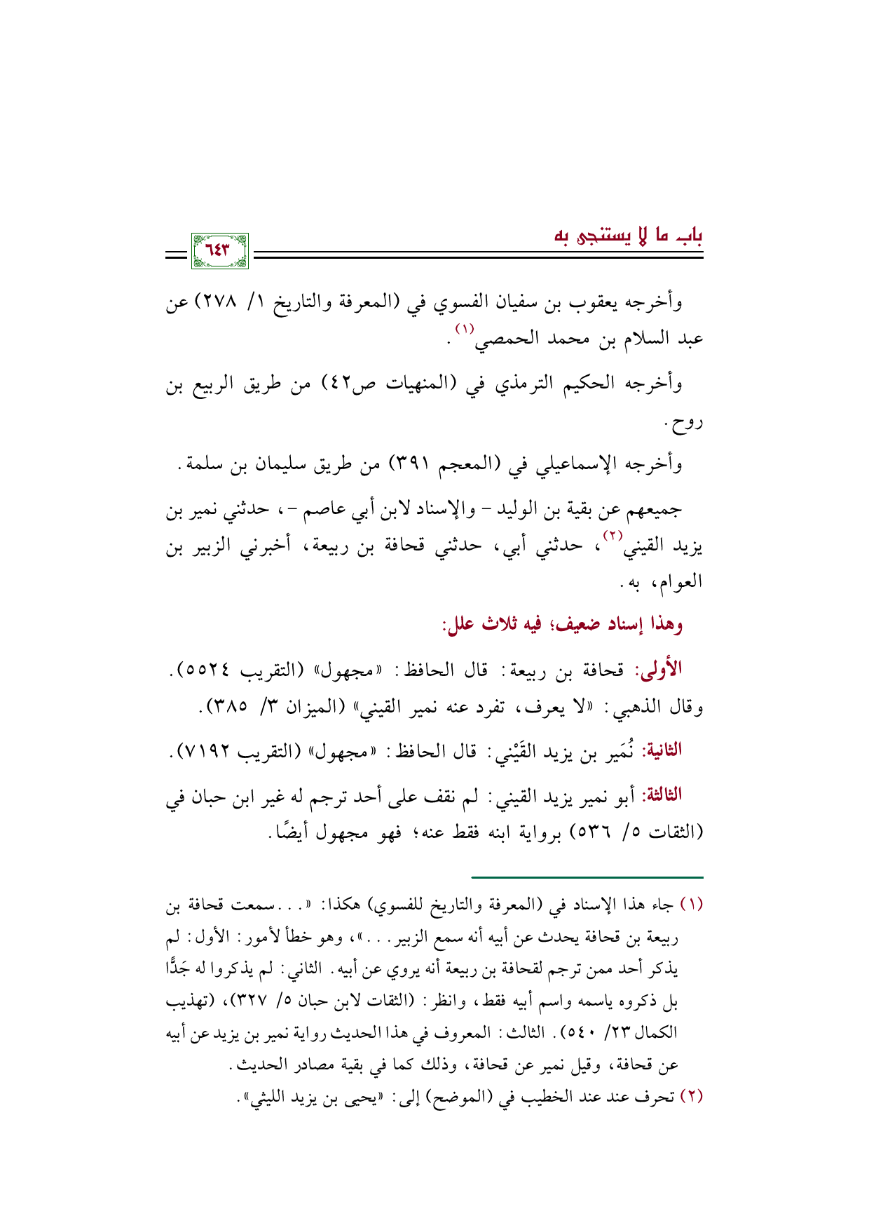 الثانية: نُمَير بن يزيد القَيْني: قال الحافظ: "مجهول" (التقريب ٧١٩٢).