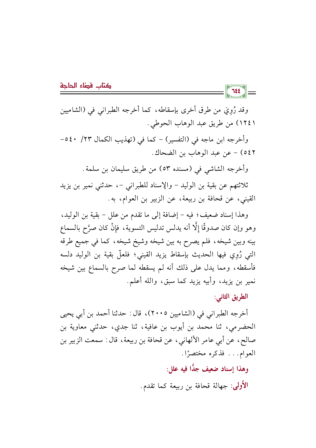 ثلاثتهم عن بقية بن الوليد- والإسناد للطبراني-، حدثني نمير بن يزيد القيني، عن قحافة بن ربيعة، عن الزبير بن العوام، به.