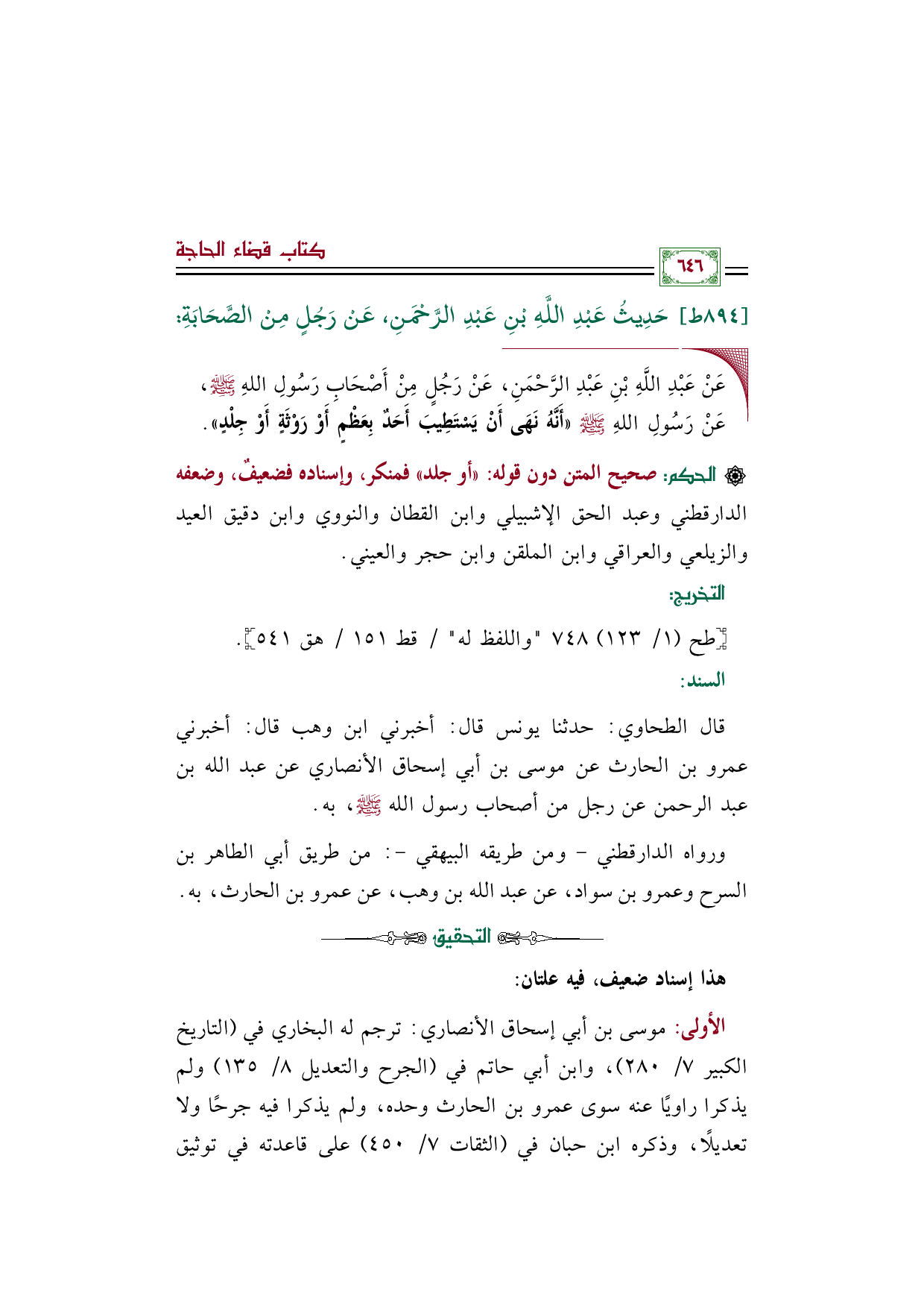 قال الطحاوي: حدثنا يونس قال: أخبرني ابن وهب قال: أخبرني عمرو بن الحارث عن موسى بن أبي إسحاق الأنصاري عن عبد الله بن عبد الرحمن عن رجل من أصحاب رسول الله صلى الله عليه وسلم، به.