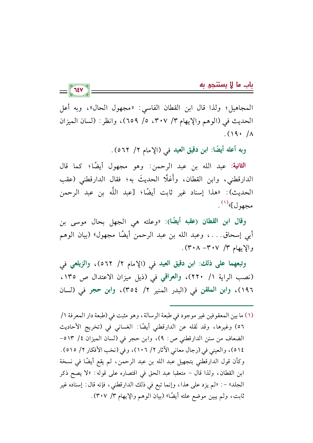 الثانية: عبد الله بن عبد الرحمن: وهو مجهول أيضًا؛ كما قال الدارقطني، وابن القطان، وأَعَلَّا الحديثَ به؛ فقال الدارقطني (عقب الحديث): "هذا إسناد غير ثابت أيضًا؛ [عبد اللَّه بن عبد الرحمن مجهول] " (¬١).