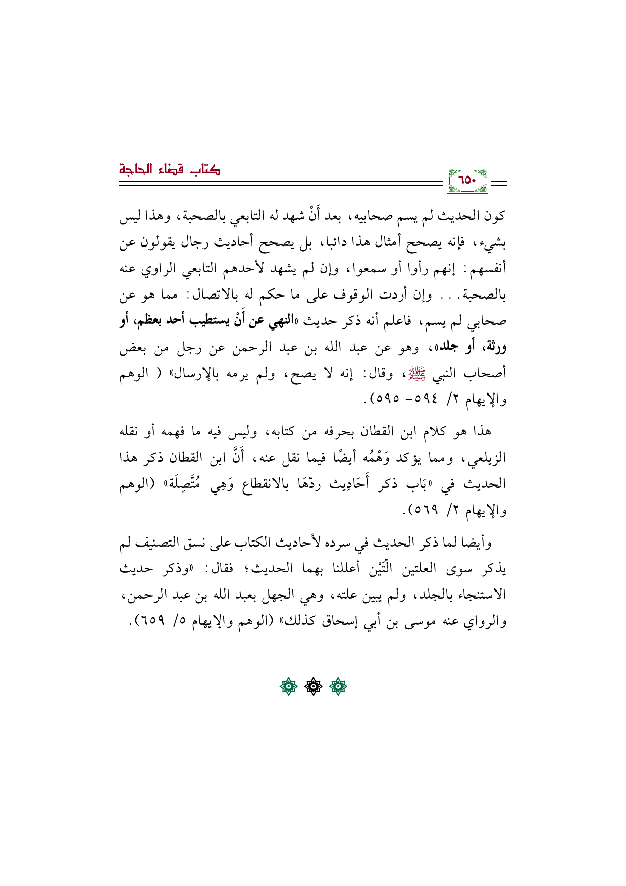 وأيضا لما ذكر الحديث في سرده لأحاديث الكتاب على نسق التصنيف لم يذكر سوى العلتين الّتَيْن أعللنا بهما الحديث؛ فقال: "وذكر حديث الاستنجاء بالجلد، ولم يبين علته، وهي الجهل بعبد الله بن عبد الرحمن، والرواي عنه موسى بن أبي إسحاق كذلك" (الوهم والإيهام ٥/ ٦٥٩).