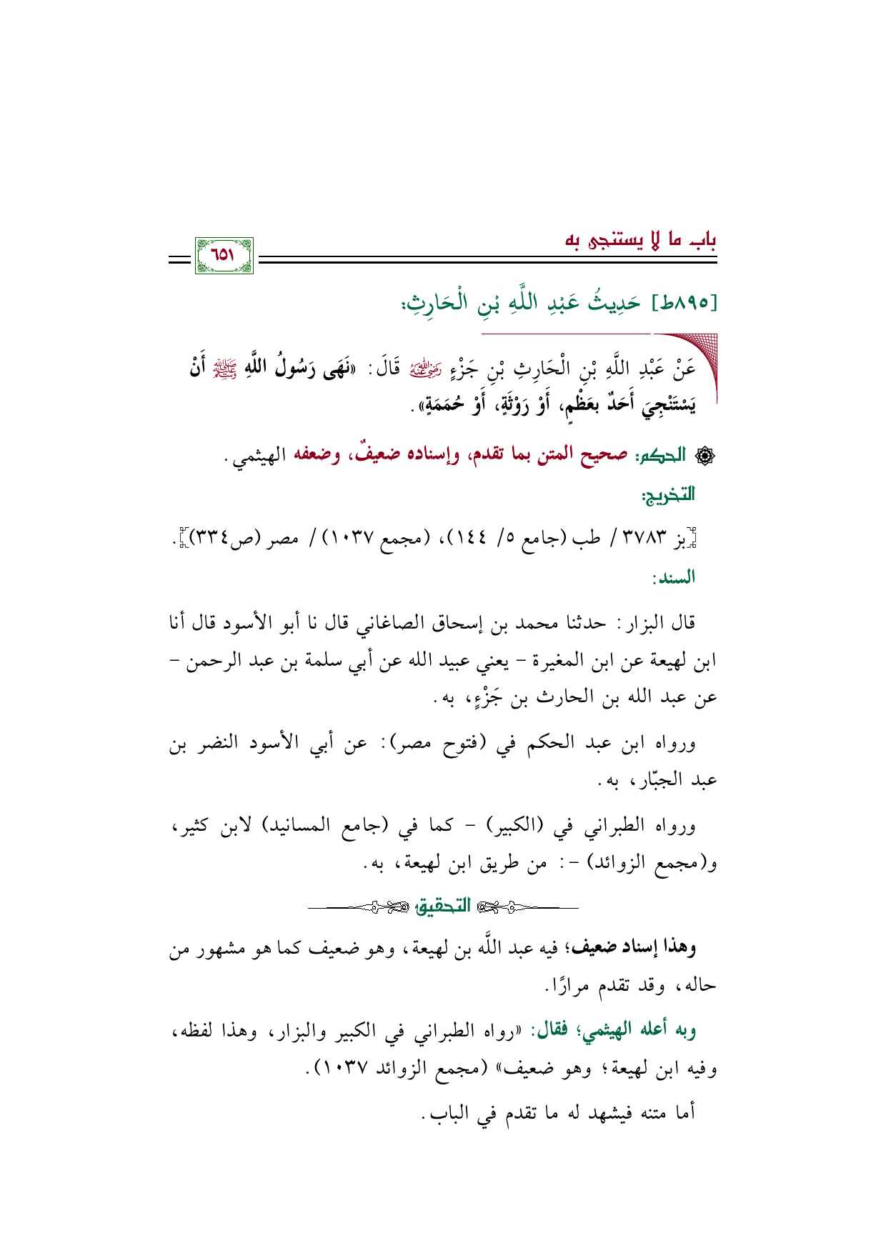 قال البزار: حدثنا محمد بن إسحاق الصاغاني قال نا أبو الأسود قال أنا ابن لهيعة عن ابن المغيرة - يعني عبيد الله عن أبي سلمة بن عبد الرحمن - عن عبد الله بن الحارث بن جَزْءٍ، به.