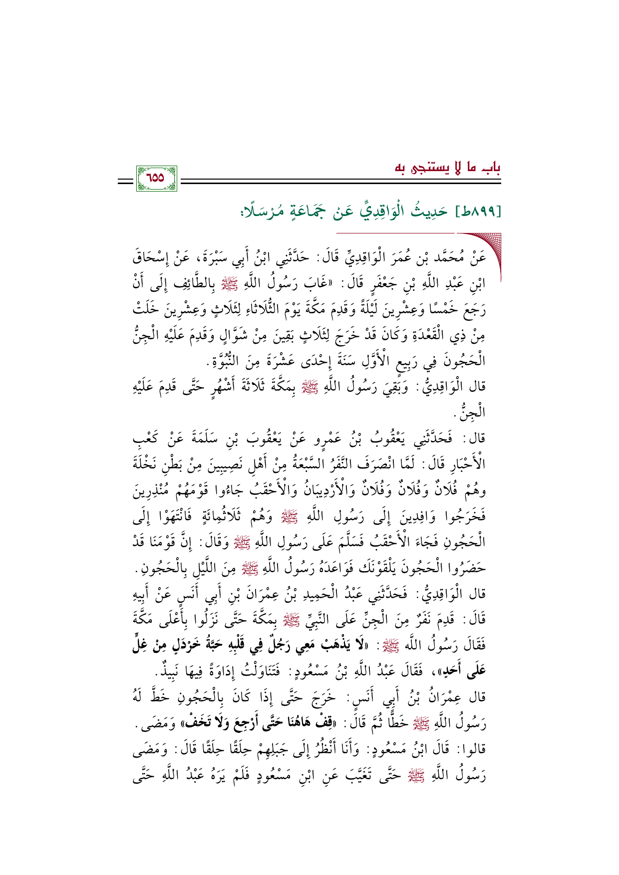 قَالَ الْوَاقِدِيُّ: فَحَدَّثَنِي عَبْدُ الْحَمِيدِ بْنُ عِمْرَانَ بْنِ أَبِي أَنَسٍ عَنْ أَبِيهِ قَالَ: قَدِمَ نَفَرٌ مِنَ الْجِنِّ عَلَى النَّبِيِّ صلى الله عليه وسلم بِمَكَّةَ حَتَّى نَزَلُوا بِأَعْلَى مَكَّةَ فَقَالَ رَسُولُ اللَّه صلى الله عليه وسلم: «لَا يَذْهَبْ مَعِي رَجُلٌ فِي قَلْبِهِ حَبَّةُ خَرْدَلٍ مِنْ غِلٍّ عَلَى أَحَدٍ»، فَقَالَ عَبْدُ اللَّهِ بْنُ مَسْعُودٍ: فَتَنَاوَلْتُ إِدَاوَةً فِيهَا نَبِيذٌ.