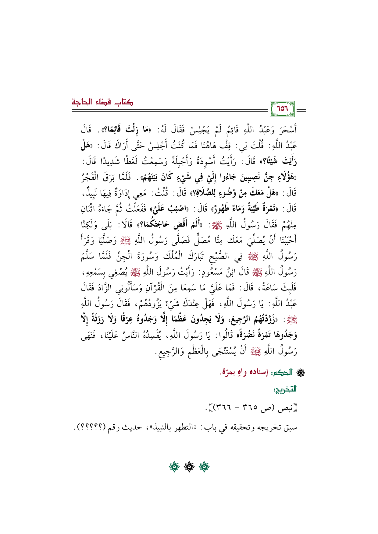فَلَمَّا بَرَقَ الْفَجْرُ قَالَ: «هَلْ مَعَكَ مِنْ وُضُوءٍ لِلصَّلَاةِ؟ » قَالَ: قُلْتُ: مَعِي إِدَاوَةٌ فِيهَا نَبِيذٌ، قَالَ: «تَمْرَةٌ طَيِّبَةٌ وَمَاءٌ طَهُورٌ» قَالَ: «اصْبُبْ عَلَيَّ» فَفَعَلْتُ ثُمَّ جَاءَهُ اثْنَانِ مِنْهُمْ فَقَالَ رَسُولُ اللَّهِ صلى الله عليه وسلم: «أَلَمْ أَقْضِ حَاجَتَكُمَا؟ » قَالَا: بَلَى وَلَكِنَّا أَحْبَبْنَا أَنْ يُصَلِّيَ مَعَكَ مِنَّا مُصَلٍّ فَصَلَّى رَسُولُ اللَّهِ صلى الله عليه وسلم وَصَلَّيَا وَقَرَأَ رَسُولُ اللَّهِ صلى الله عليه وسلم فِي الصُّبْحِ تَبَارَكَ الْمُلْكَ وَسُورَةَ الْجِنِّ فَلَمَّا سَلَّمَ رَسُولُ اللَّهِ صلى الله عليه وسلم قَالَ ابْنُ مَسْعُودٍ: رَأَيْتُ رَسُولَ اللَّهِ صلى الله عليه وسلم يُصْغِي بِسَمْعِهِ، فَلَبِثَ سَاعَةً، قَالَ: فَمَا عَلَيَّ مَا سَمِعَا مِنَ الْقُرْآنِ وَسَأَلُونِي الزَّادَ فَقَالَ عَبْدُ اللَّهِ: يَا رَسُولَ اللَّهِ، فَهَلْ عِنْدَكَ شَيْءٌ يَزُودُهُمْ، فَقَالَ رَسُولُ اللَّهِ صلى الله عليه وسلم: «زَوَّدْتُهُمُ الرَّجِيعَ، وَلَا يَجِدُونَ عَظْمًا إِلَّا وَجَدُوهُ عِرْقًا وَلَا رَوْثَةً إِلَّا وَجَدُوهَا تَمْرَةً نَضْرَةً» قَالُوا: يَا رَسُولَ اللَّهِ، يُفْسِدُهُ النَّاسُ عَلَيْنَا، فَنَهَى رَسُولُ اللَّهِ صلى الله عليه وسلم أَنْ يُسْتَنْجَى بِالْعَظْمِ وَالرَّجِيعِ.
