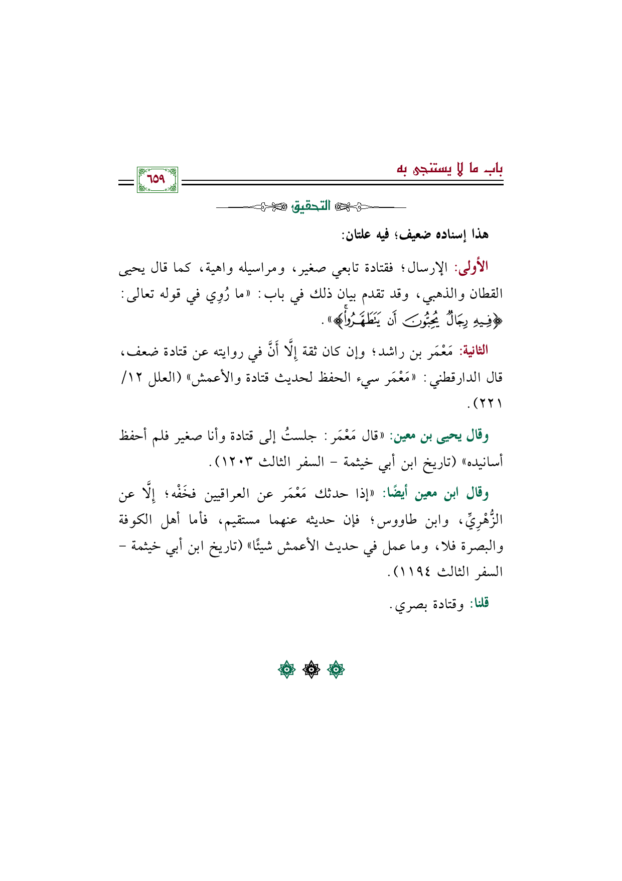 الأولى: الإرسال؛ فقتادة تابعي صغير، ومراسيله واهية، كما قال يحيى القطان والذهبي، وقد تقدم بيان ذلك في باب: "ما رُوِي في قوله تعالى: {فِيهِ رِجَالٌ يُحِبُّونَ أَنْ يَتَطَهَّرُوا} ".