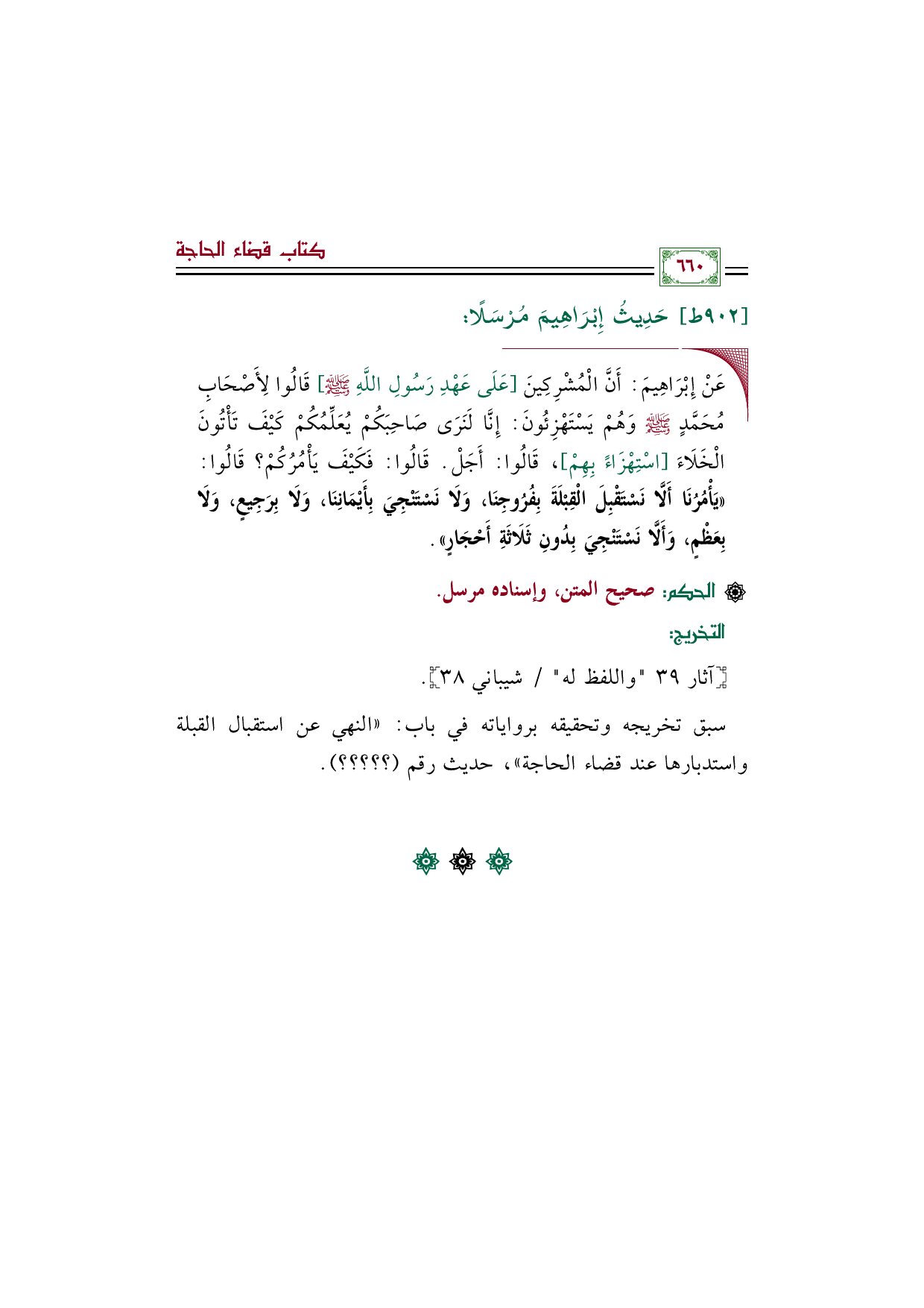◼ عَنْ إِبْرَاهِيمَ: أَنَّ الْمُشْرِكِينَ [عَلَى عَهْدِ رَسُولِ اللَّهِ صَلَّى اللهُ عَلَيْهِ وَسَلَّمَ] قَالُوا لِأَصْحَابِ مُحَمَّدٍ صَلَّى اللهُ عَلَيْهِ وَسَلَّمَ وَهُمْ يَسْتَهْزِئُونَ: إِنَّا لَنَرَى صَاحِبَكُمْ يُعَلِّمُكُمْ كَيْفَ تَأْتُونَ الْخَلَاءَ [اسْتِهْزَاءً بِهِمْ]، قَالُوا: أَجَلْ. قَالُوا: فَكَيْفَ يَأْمُرُكُمْ؟ قَالُوا: «يَأْمُرُنَا أَلَّا نَسْتَقْبِلَ الْقِبْلَةَ بِفُرُوجِنَا، وَلَا نَسْتَنْجِيَ بِأَيْمَانِنَا، وَلَا بِرَجِيعٍ، وَلَا بِعَظْمٍ، وَأَلَّا نَسْتَنْجِيَ بِدُونِ ثَلَاثَةِ أَحْجَارٍ».