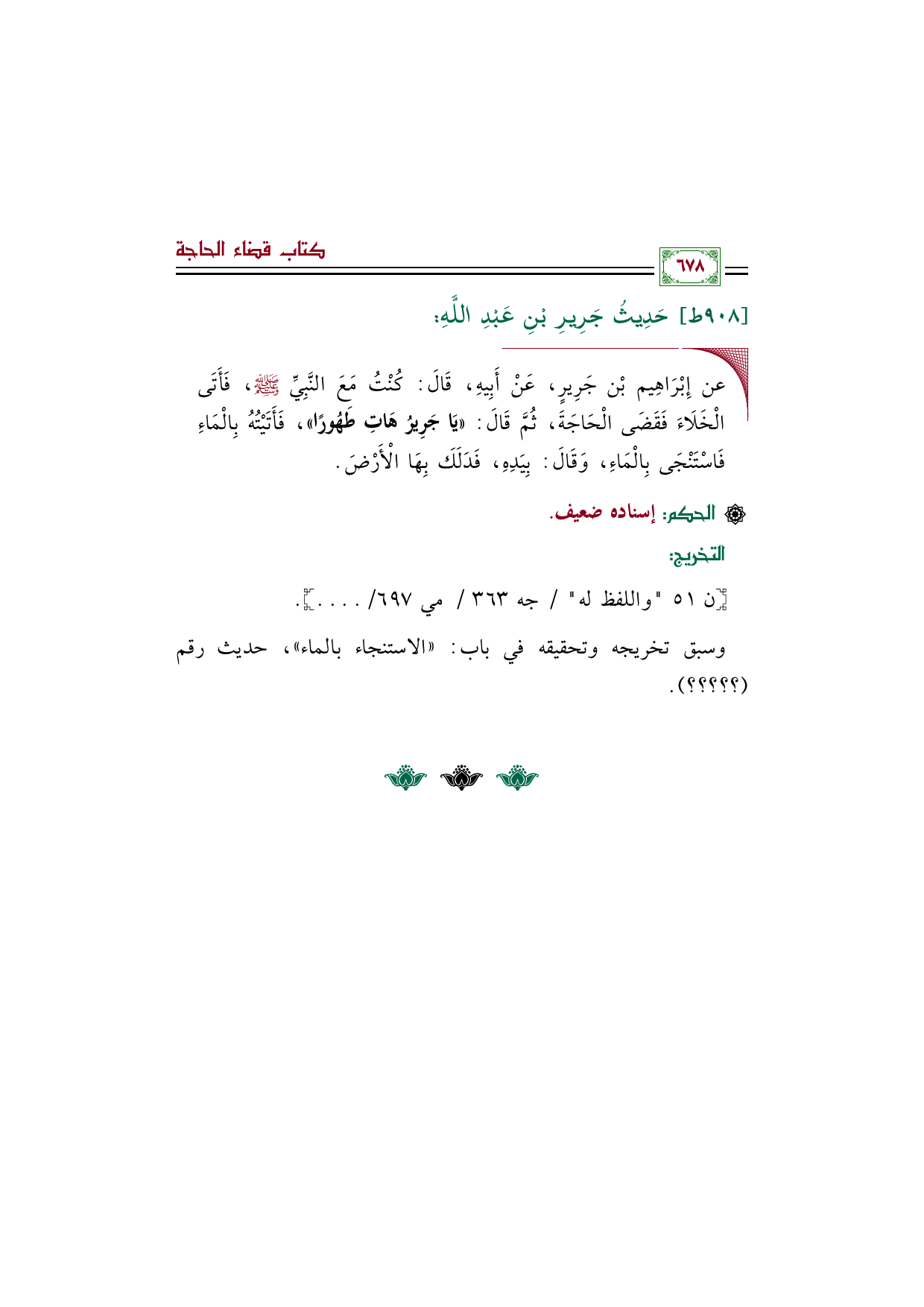 ◼ عن إِبْرَاهِيم بْن جَرِيرٍ، عَنْ أَبِيهِ، قَالَ: كُنْتُ مَعَ النَّبِيِّ صَلَّى اللهُ عَلَيْهِ وَسَلَّمَ، فَأَتَى الْخَلَاءَ فَقَضَى الْحَاجَةَ، ثُمَّ قَالَ: «يَا جَرِيرُ هَاتِ طَهُورًا»، فَأَتَيْتُهُ بِالْمَاءِ فَاسْتَنْجَى بِالْمَاءِ، وَقَالَ: بِيَدِهِ، فَدَلَكَ بِهَا الْأَرْضَ.