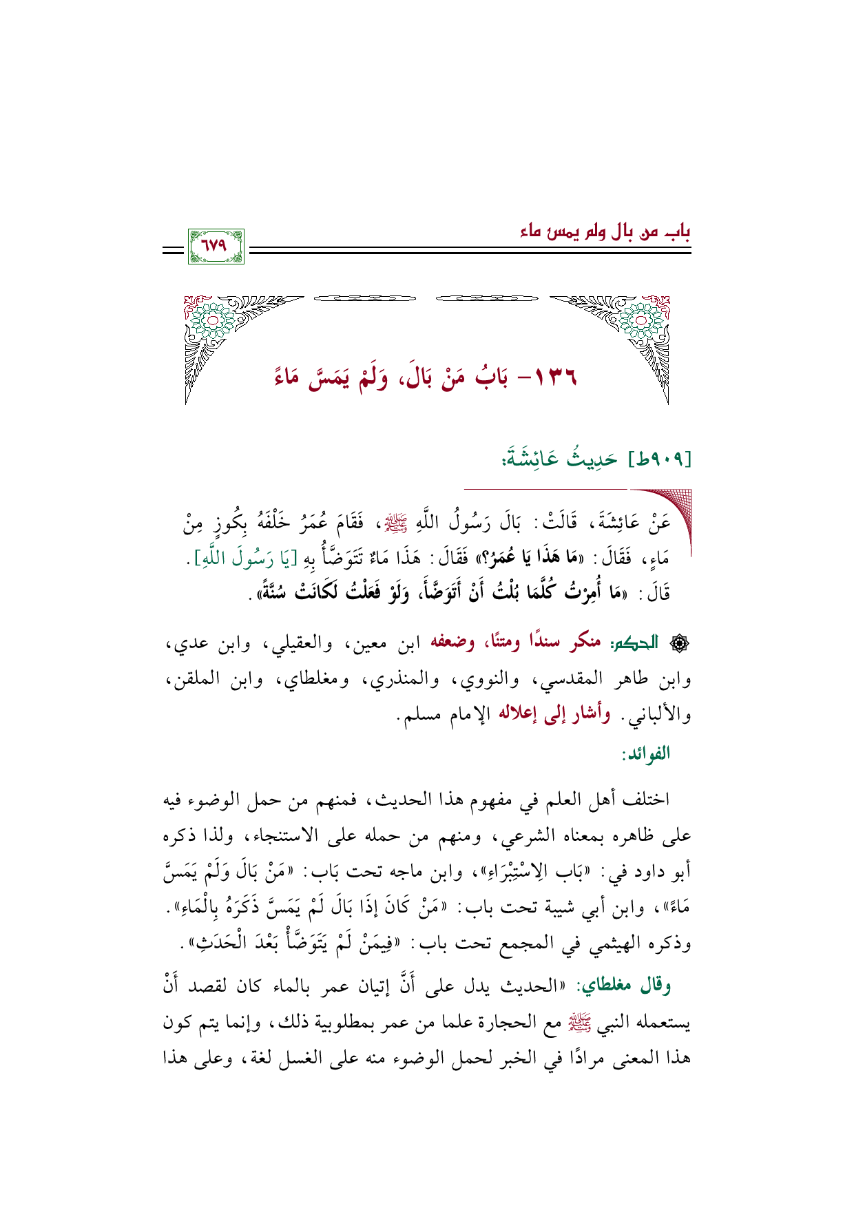 وقال مغلطاي: "الحديث يدل على أَنَّ إتيان عمر بالماء كان لقصد أَنْ يستعمله النبي صلى الله عليه وسلم مع الحجارة علما من عمر بمطلوبية ذلك، وإنما يتم كون هذا المعنى مرادًا في الخبر لحمل الوضوء منه على الغسل لغة، وعلى هذا