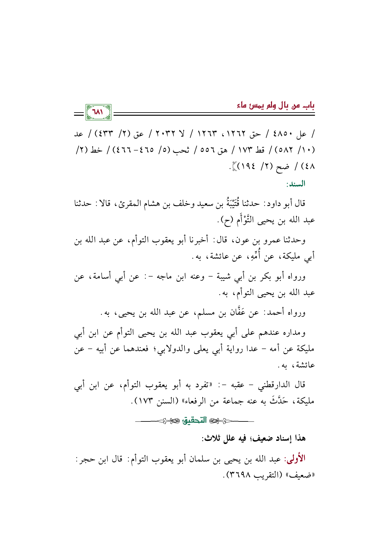 قال الدارقطني - عقبه -: "تفرد به أبو يعقوب التوأم، عن ابن أبي مليكة، حَدَّثَ به عنه جماعة من الرفعاء" (السنن ١٧٣).