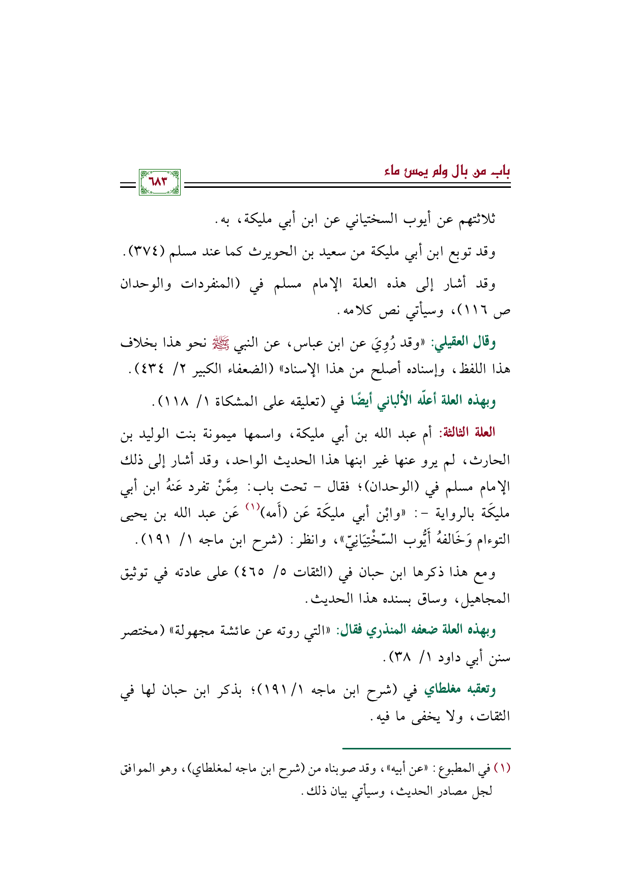 العلة الثالثة: أم عبد الله بن أبي مليكة، واسمها ميمونة بنت الوليد بن الحارث، لم يرو عنها غير ابنها هذا الحديث الواحد، وقد أشار إلى ذلك الإمام مسلم في (الوحدان)؛ فقال - تحت باب: مِمَّنْ تفرد عَنهُ ابن أبي مليكَة بالرواية -: "وابْن أبي مليكَة عَن (أَمه) (¬١) عَن عبد الله بن يحيى التوءام وَخَالفهُ أَيُّوب السّخْتِيَانِيّ"، وانظر: (شرح ابن ماجه ١/ ١٩١).
