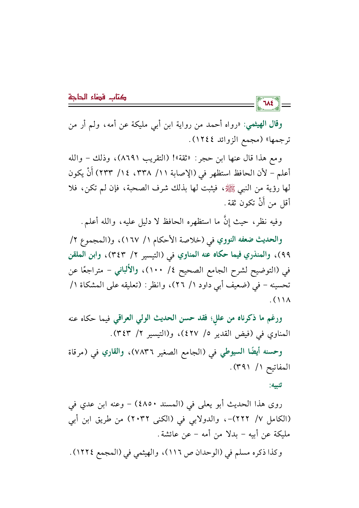 وقال الهيثمي: "رواه أحمد من رواية ابن أبي مليكة عن أمه، ولم أر من ترجمها" (مجمع الزوائد ١٢٤٤).