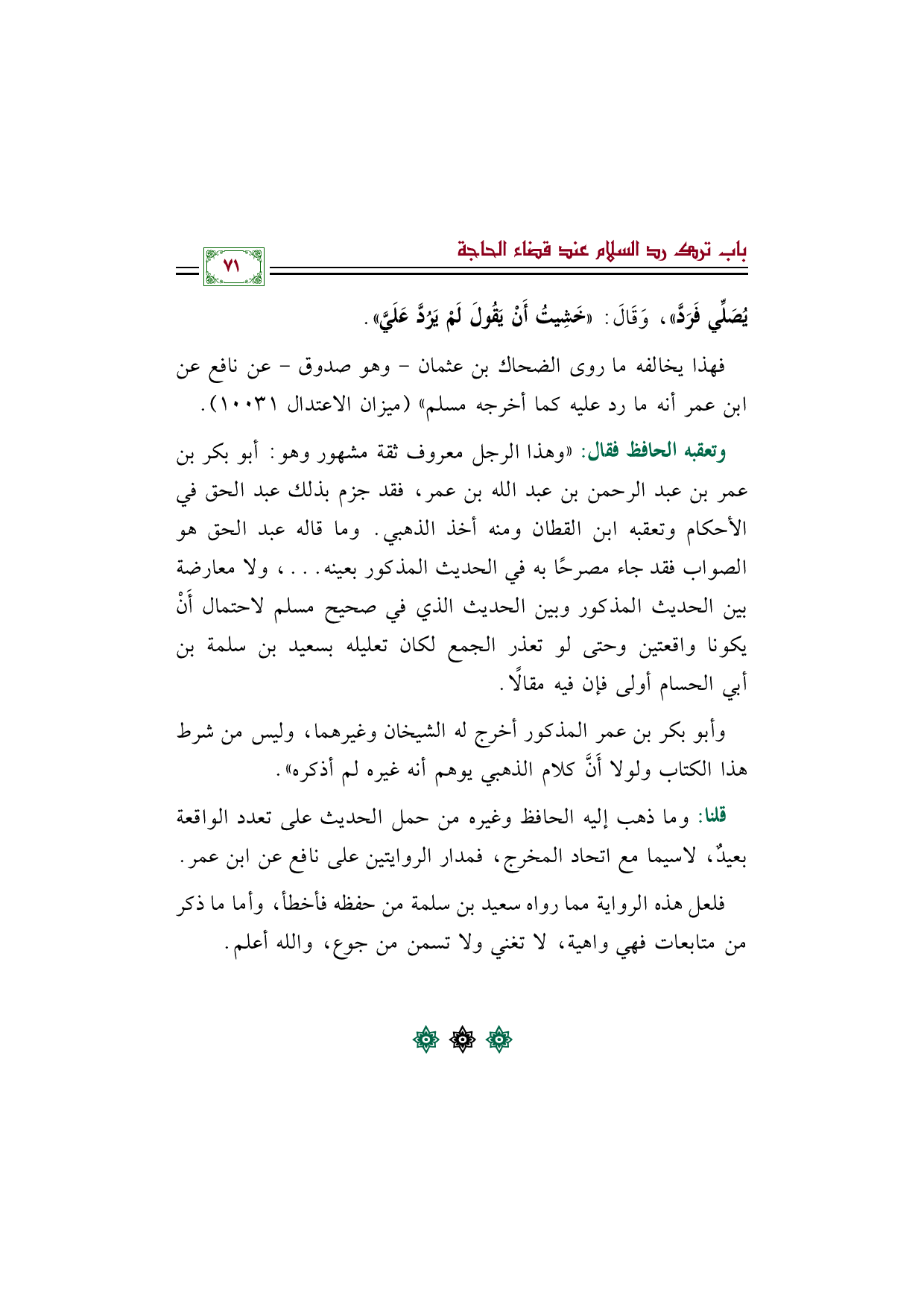 فهذا يخالفه ما روى الضحاك بن عثمان - وهو صدوق - عن نافع عن ابن عمر أنه ما رد عليه كما أخرجه مسلم" (ميزان الاعتدال ١٠٠٣١).