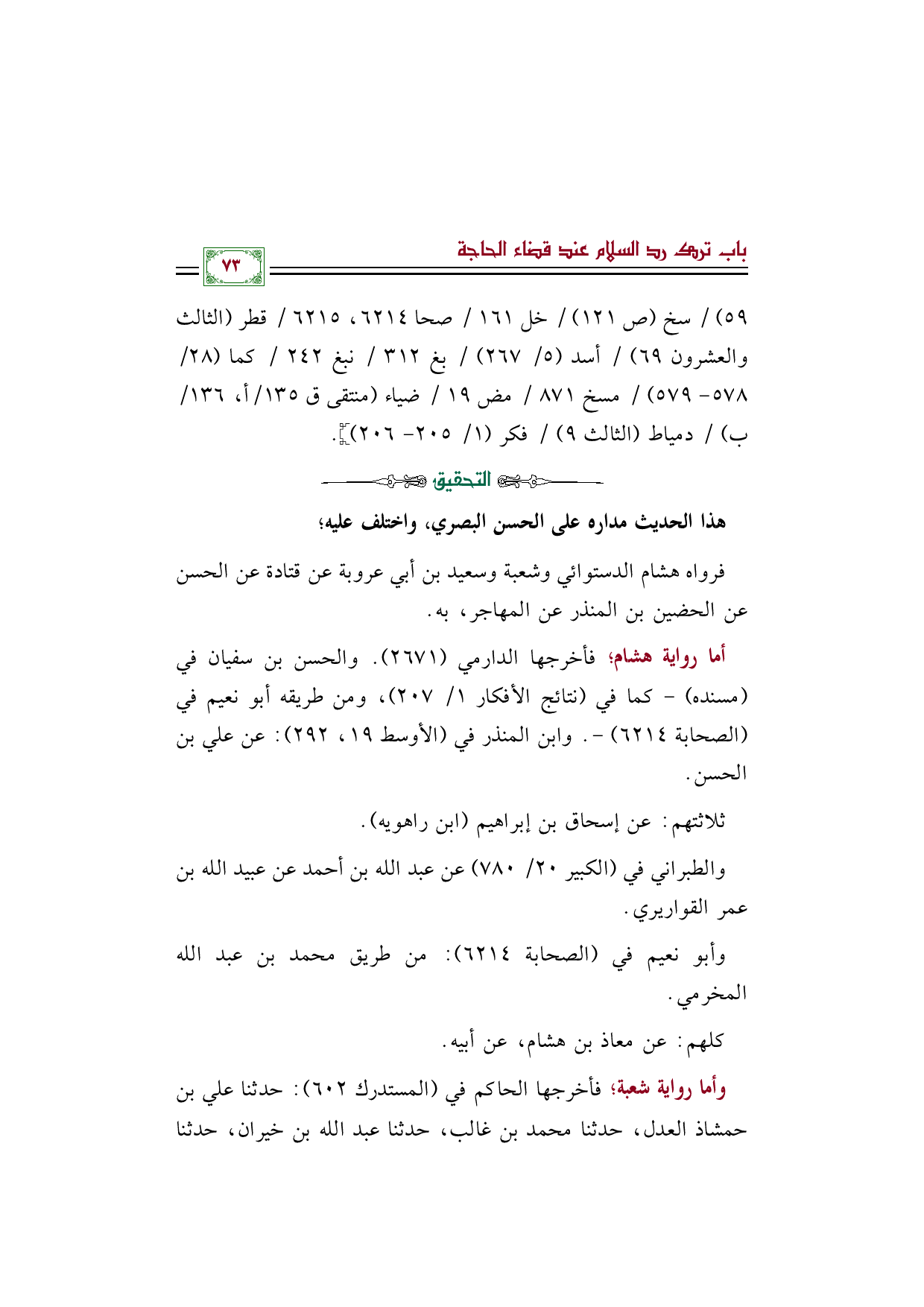 أما رواية هشام؛ فأخرجها الدارمي (٢٦٧١). والحسن بن سفيان في "مسنده" - كما في (نتائج الأفكار ١/ ٢٠٧)، ومن طريقه أبو نعيم في (الصحابة ٦٢١٤) -. وابن المنذر في (الأوسط ١٩، ٢٩٢): عن علي بن الحسن.