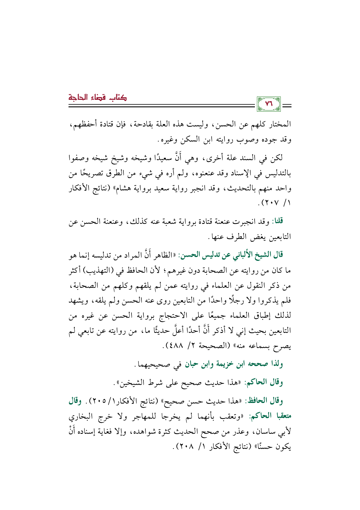 لكن في السند علة أخرى، وهي أَنَّ سعيدًا وشيخه وشيخ شيخه وصفوا بالتدليس في الإسناد وقد عنعنوه، ولم أره في شيء من الطرق تصريحًا من واحد منهم بالتحديث، وقد انجبر رواية سعيد برواية هشام" (نتائج الأفكار ١/ ٢٠٧).