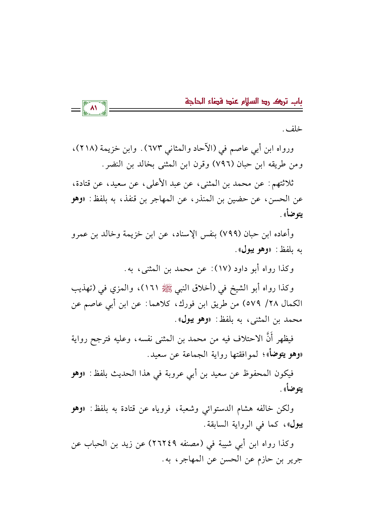 ثلاثتهم: عن محمد بن المثنى، عن عبد الأعلى، عن سعيد، عن قتادة، عن الحسن، عن حضين بن المنذر، عن المهاجر بن قنفذ، به بلفظ: «وهو يتوضأ».
