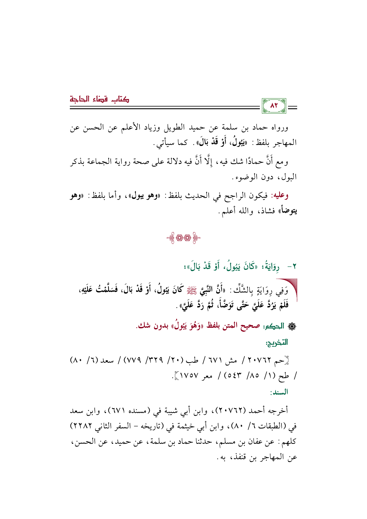 ورواه حماد بن سلمة عن حميد الطويل وزياد الأعلم عن الحسن عن المهاجر بلفظ: «يَبُولُ، أَوْ قَدْ بَالَ». كما سيأتي.