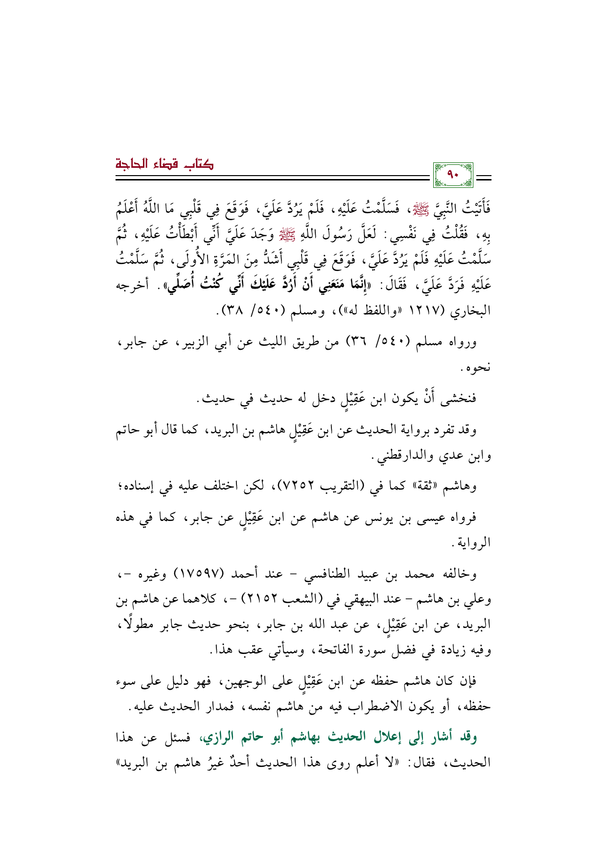 فَأَتَيْتُ النَّبِيَّ صَلَّى اللهُ عَلَيْهِ وَسَلَّمَ، فَسَلَّمْتُ عَلَيْهِ، فَلَمْ يَرُدَّ عَلَيَّ، فَوَقَعَ فِي قَلْبِي مَا اللَّهُ أَعْلَمُ بِهِ، فَقُلْتُ فِي نَفْسِي: لَعَلَّ رَسُولَ اللَّهِ صَلَّى اللهُ عَلَيْهِ وَسَلَّمَ وَجَدَ عَلَيَّ أَنِّي أَبْطَأْتُ عَلَيْهِ، ثُمَّ سَلَّمْتُ عَلَيْهِ فَلَمْ يَرُدَّ عَلَيَّ، فَوَقَعَ فِي قَلْبِي أَشَدُّ مِنَ المَرَّةِ الأُولَى، ثُمَّ سَلَّمْتُ عَلَيْهِ فَرَدَّ عَلَيَّ، فَقَالَ: «إِنَّمَا مَنَعَنِي أَنْ أَرُدَّ عَلَيْكَ أَنِّي كُنْتُ أُصَلِّي». أخرجه البخاري (١٢١٧ "واللفظ له")، ومسلم (٥٤٠/ ٣٨).