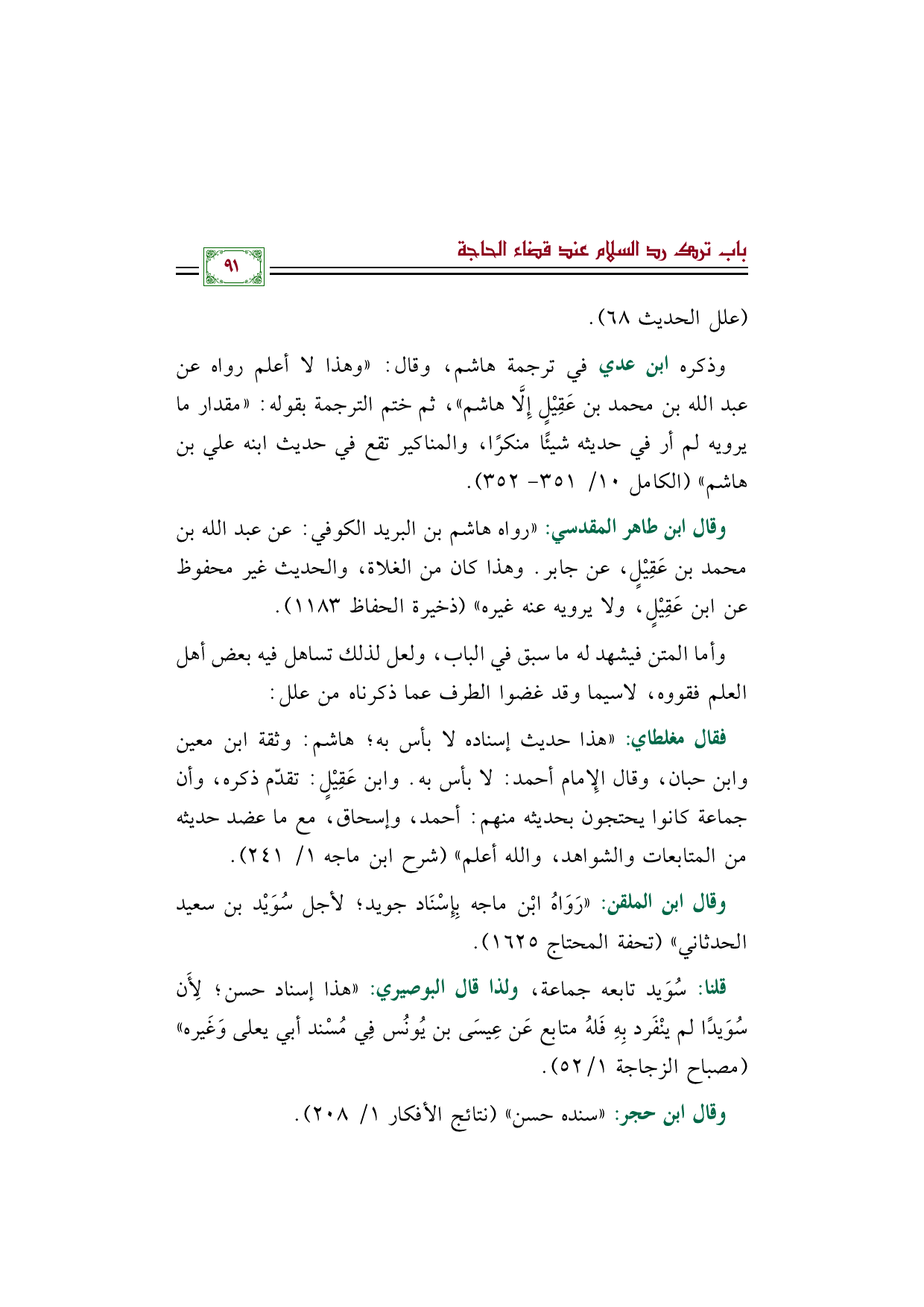 فقال مغلطاي: "هذا حديث إسناده لا بأس به؛ هاشم: وثقة ابن معين وابن حبان، وقال الإِمام أحمد: لا بأس به. وابن عَقِيْلٍ: تقدّم ذكره، وأن جماعة كانوا يحتجون بحديثه منهم: أحمد، وإسحاق، مع ما عضد حديثه من المتابعات والشواهد، والله أعلم" (شرح ابن ماجه ١/ ٢٤١).