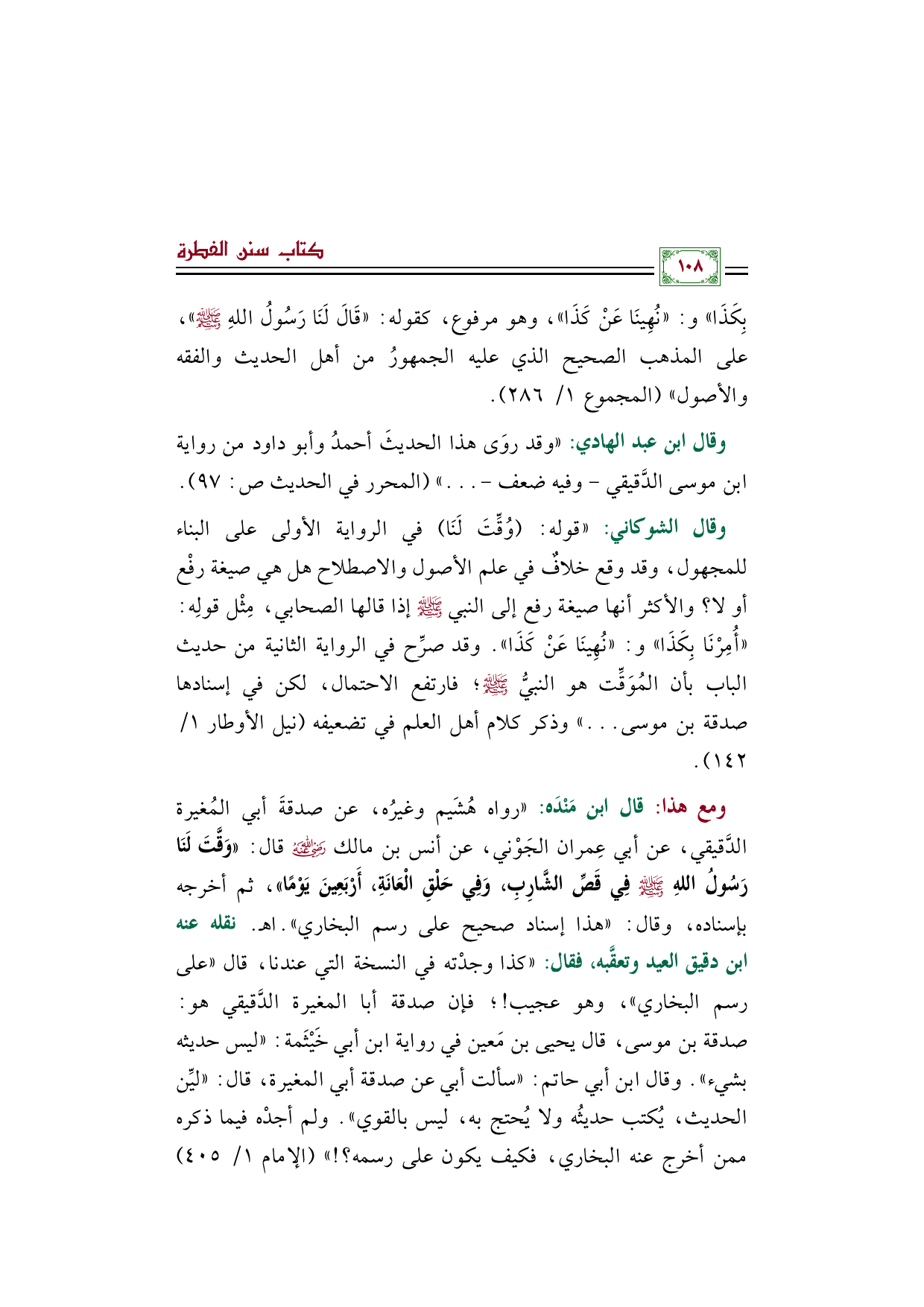ومع هذا: قال ابن مَنْدَه: "رواه هُشَيم وغيرُه، عن صدقةَ أبي المُغيرة الدَّقيقي، عن أبي عِمران الجَوْني، عن أنس بن مالك رضي الله عنه قال: ((وَقَّتَ لَنَا رَسُولُ اللهِ صَلَّى اللهُ عَلَيْهِ وَسَلَّمَ فِي قَصِّ الشَّارِبِ، وَفِي حَلْقِ الْعَانَةِ، أَرْبَعِينَ يَوْمًا))، ثم أخرجه بإسناده، وقال: "هذا إسناد صحيح على رسم البخاري".ا. هـ نقله عنه ابن دقيق العيد وتعقَّبه، فقال: "كذا وجدْته في النسخة التي عندنا، قال "على رسم البخاري"، وهو عجيب! ؛ فإن صدقة أبا المغيرة الدَّقيقي هو: صدقة بن موسى، قال يحيى بن مَعين في رواية ابن أبي خَيْثَمة: "ليس حديثه بشيء". وقال ابن أبي حاتم: "سألت أبي عن صدقة أبي المغيرة، قال: "ليِّن الحديث، يُكتب حديثُه ولا يُحتج به، ليس بالقوي". ولم أجدْه فيما ذكره ممن أخرج عنه البخاري، فكيف يكون على رسمه؟ ! " (الإمام ١/ ٤٠٥)