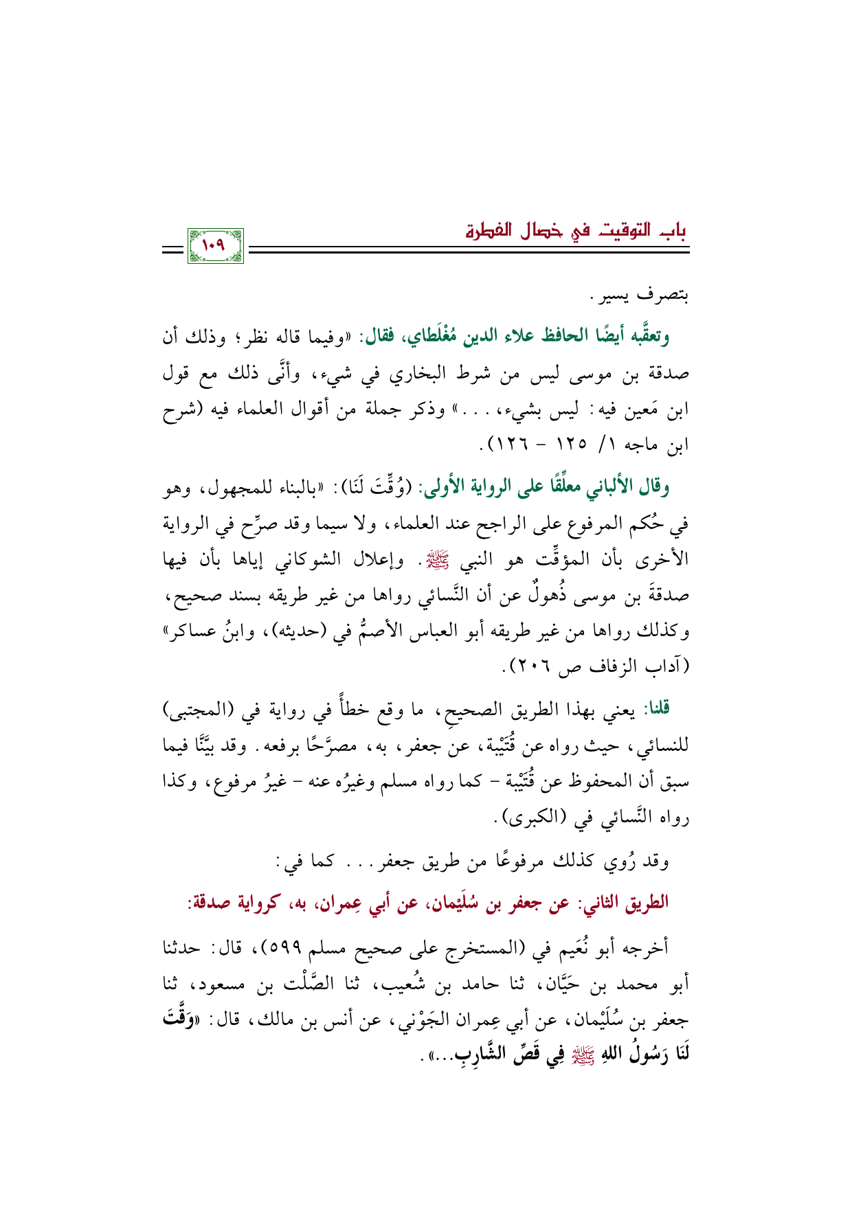 قلنا: يعني بهذا الطريق الصحيحِ، ما وقع خطأً في رواية في "المجتبى" للنسائي، حيث رواه عن قُتَيْبة، عن جعفر، به، مصرَّحًا برفعه. وقد بيَّنَّا فيما سبق أن المحفوظ عن قُتَيْبة- كما رواه مسلم وغيرُه عنه- غيرُ مرفوع، وكذا رواه النَّسائي في (الكبرى).