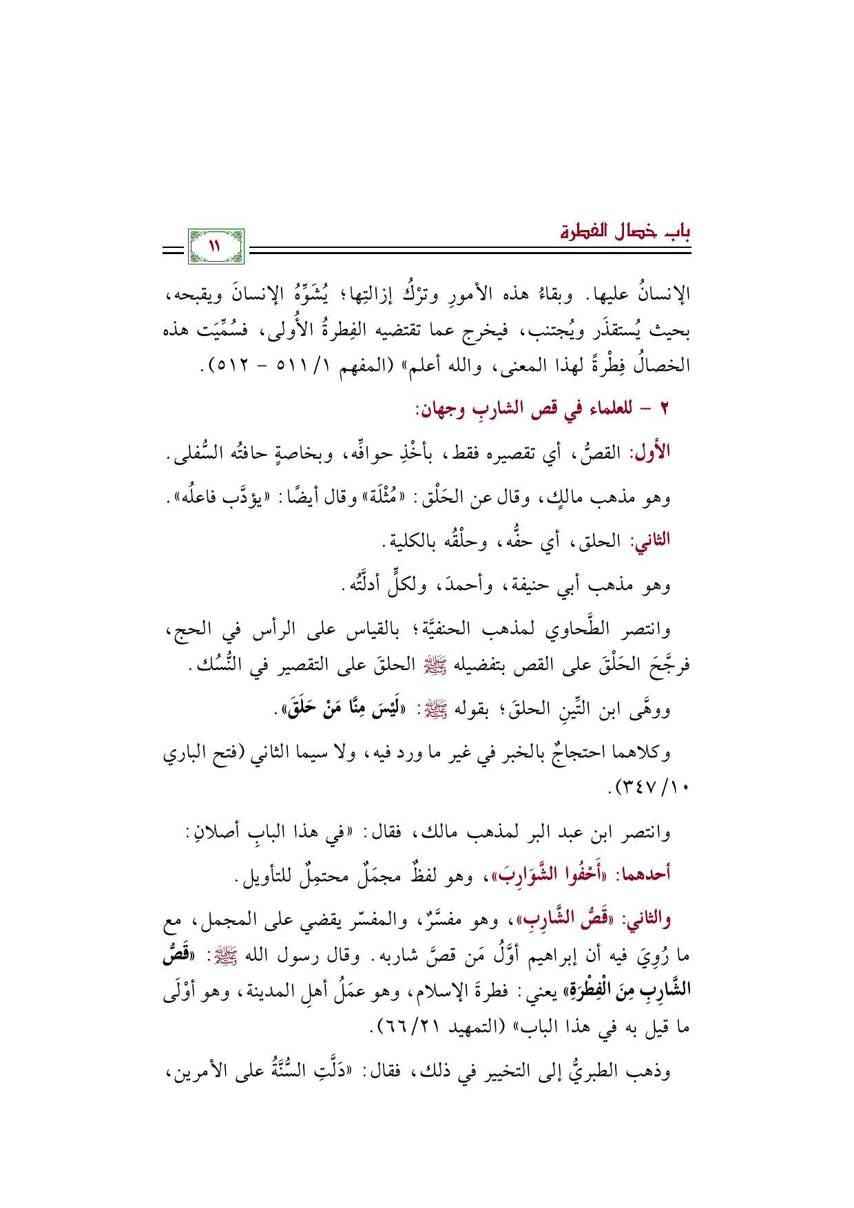 والثاني: ((قَصُّ الشَّارِبِ))، وهو مفسَّرٌ، والمفسّر يقضي على المجمل، مع ما رُوِيَ فيه أن إبراهيم أوَّلُ مَن قصَّ شاربه. وقال رسول الله صلى الله عليه وسلم: ((قَصُّ الشَّارِبِ مِنَ الْفِطْرَةِ)) يعني: فطرةَ الإسلام، وهو عمَلُ أهلِ المدينة، وهو أوْلَى ما قيل به في هذا الباب" (التمهيد ٢١/ ٦٦).