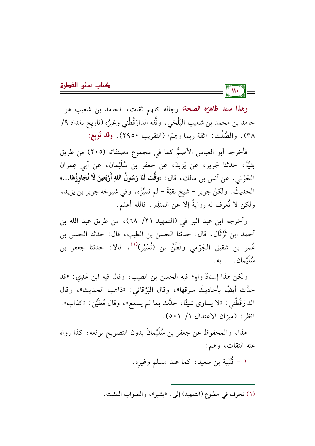 وأخرجه ابن عبد البر في (التمهيد ٢١/ ٦٨)، من طريق عبد الله بن أحمد ابن ثَرْثَال، قال: حدثنا الحسن بن الطيب، قال: حدثنا الحسن بن عُمر بن شقيق الجَرْمي وقَطَنُ بن (نُسَيْر) (¬١)، قالا: حدثنا جعفر بن سُلَيْمان ... به.