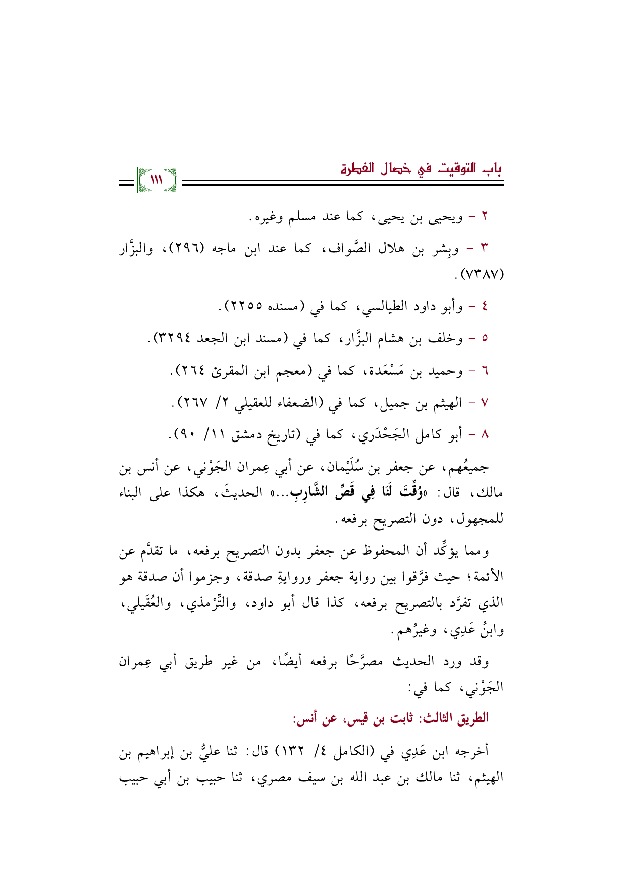 جميعُهم، عن جعفر بن سُلَيْمان، عن أبي عِمران الجَوْني، عن أنس بن مالك، قال: ((وُقِّتَ لَنَا فِي قَصِّ الشَّارِبِ ... )) الحديثَ، هكذا على البناء للمجهول، دون التصريح برفعه.