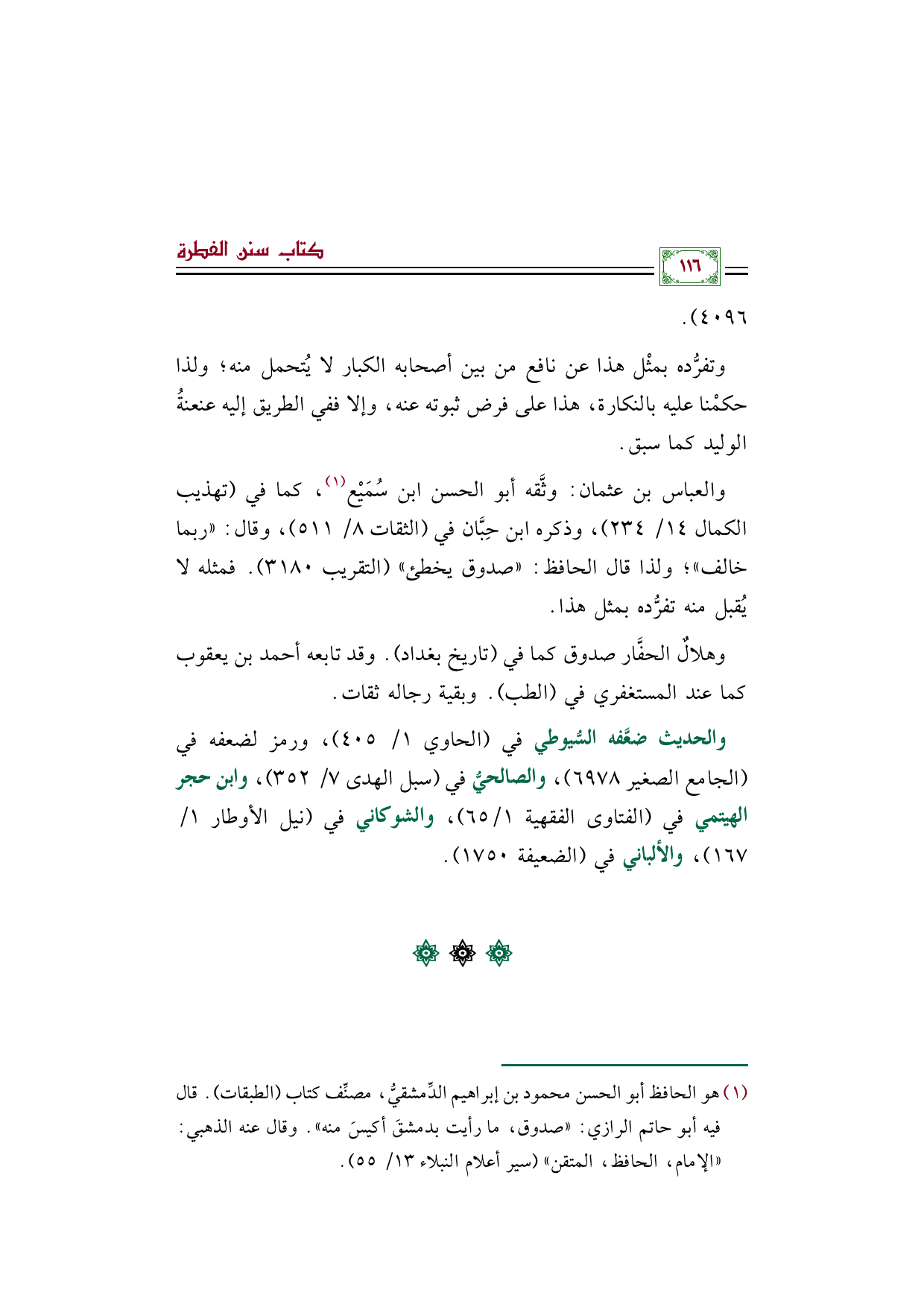 والعباس بن عثمان: وثَّقه أبو الحسن ابن سُمَيْع (¬١)، كما في (تهذيب الكمال ١٤/ ٢٣٤)، وذكره ابن حِبَّان في (الثقات ٨/ ٥١١)، وقال: "ربما خالف"؛ ولذا قال الحافظ: "صدوق يخطئ" (التقريب ٣١٨٠). فمثله لا يُقبل منه تفرُّده بمثل هذا.