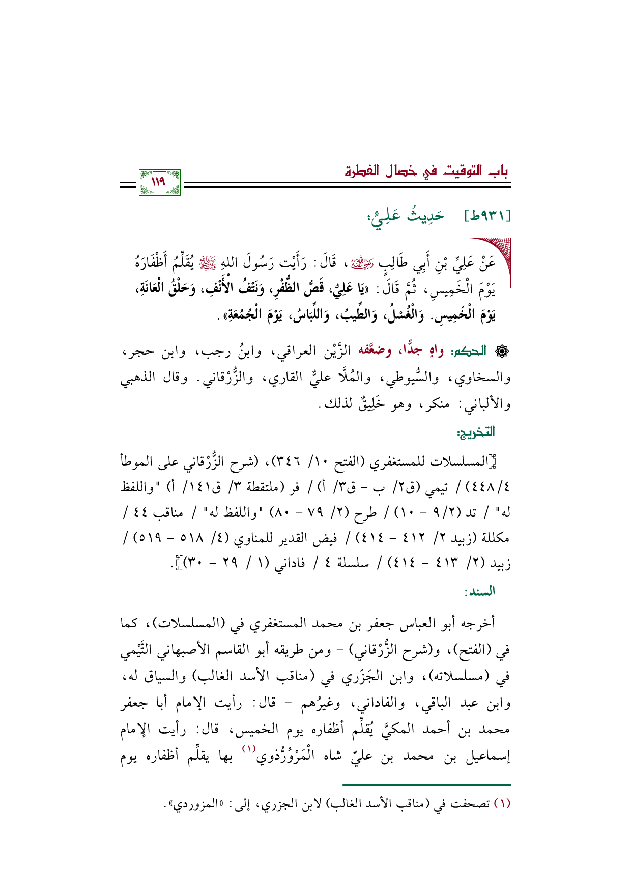 أخرجه أبو العباس جعفر بن محمد المستغفري في "المسلسلات"، كما في "الفتح"، و"شرح الزُّرْقاني"- ومن طريقه أبو القاسم الأصبهاني التَّيْمي في "مسلسلاته"، وابن الجَزَري في "مناقب الأسد الغالب" والسياق له، وابن عبد الباقي، والفاداني، وغيرُهم- قال: رأيت الإمام أبا جعفر محمد بن أحمد المكيَّ يُقلِّم أظفاره يوم الخميس، قال: رأيت الإمام إسماعيل بن محمد بن عليّ شاه الْمَرْوُرُّذوي (¬١) بها يقلِّم أظفاره يوم